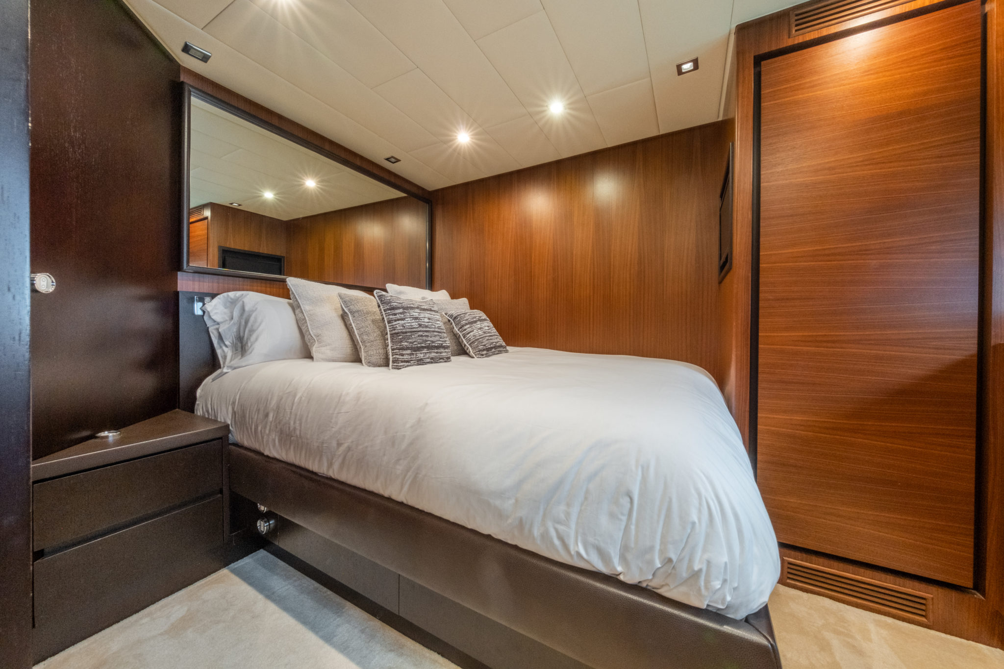 Inside, AYA ONE features a contemporary interior with a bright and welcoming ambiance. The accommodation is arranged across four cabins, including a spacious master suite, a VIP cabin, a double cabin, and a twin cabin with additional Pullman berths, each with en-suite facilities. The layout is thoughtfully designed to offer privacy, flexibility, and a relaxed home-at-sea comfort for families or groups of friends.