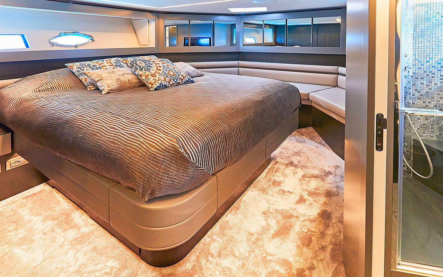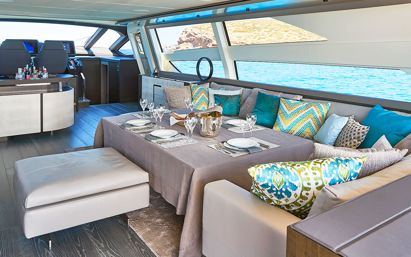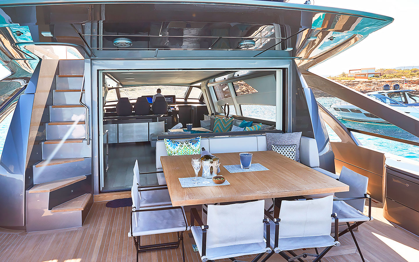 Outdoor living is a key highlight. The aft deck offers a comfortable lounge and dining area complemented by generous sunpads, creating an ideal space for relaxing or entertaining. Additional lounging areas can be found at the bow, where spacious sunbeds and seating invite guests to unwind with open views. The flybridge provides yet another stylish setting for enjoying time outdoors.