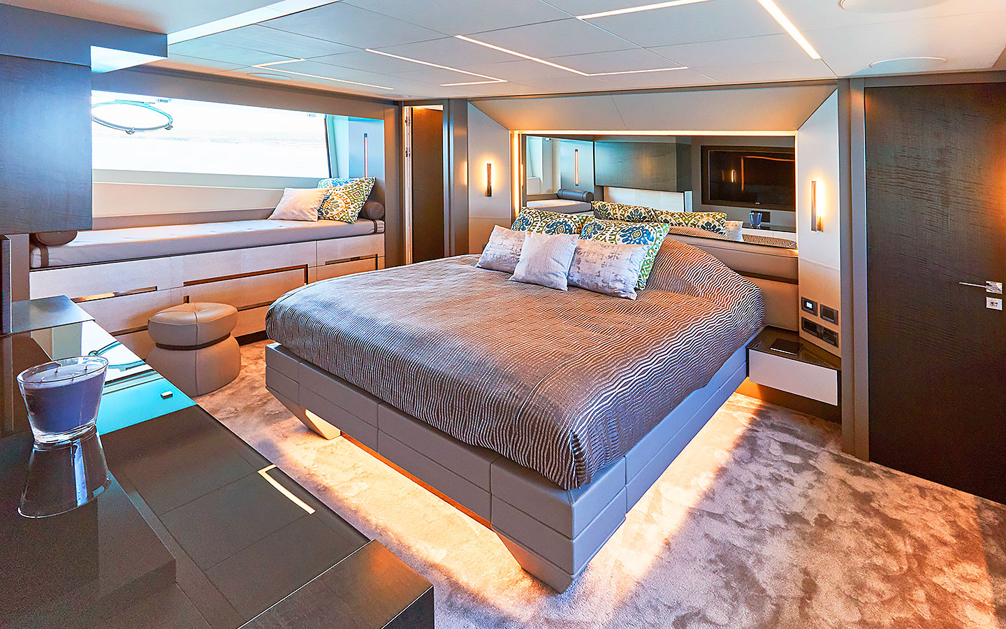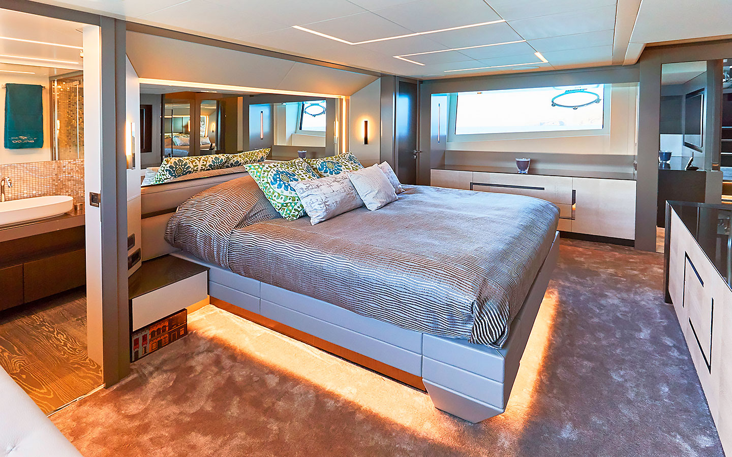 BALOO III features a contemporary interior styled with refined materials and a clean, modern finish. The main salon offers a bright and comfortable lounge space enhanced by large windows and a practical layout for time spent indoors. Accommodation is arranged across four cabins, comprising a Master suite, one VIP cabin, and two twin cabins. Each cabin is designed to provide comfort and privacy for guests on board.