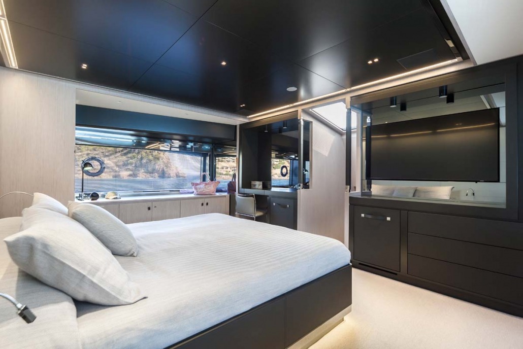 Inside, the atmosphere is bright, modern, and welcoming. Large windows flood the main salon with natural light, creating a serene space for relaxation or socialising. Accommodation is thoughtfully arranged in four en-suite cabins, including a spacious main deck master and additional guest cabins, each finished with refined touches and premium comfort for overnight stays.