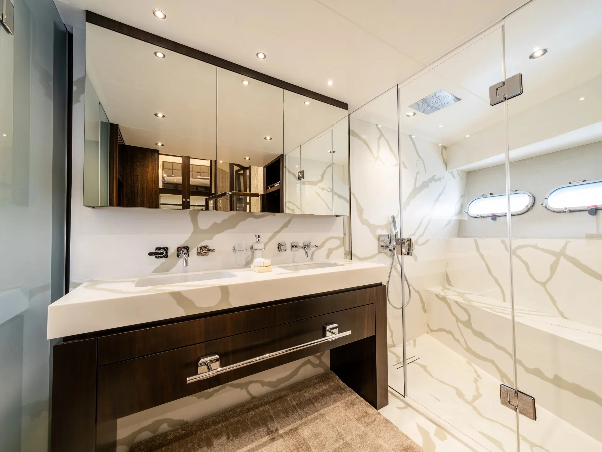 Inside, BLUE INFINITY features a bright and stylish interior with a modern, welcoming atmosphere. Accommodation is arranged across five well-appointed cabins, including a Master cabin with a king-size bed, two VIP cabins with double beds, and two guest cabins with twin beds, complemented by two Pullman berths for added flexibility. Each cabin is finished to a high standard, offering comfort and privacy for guests on board.