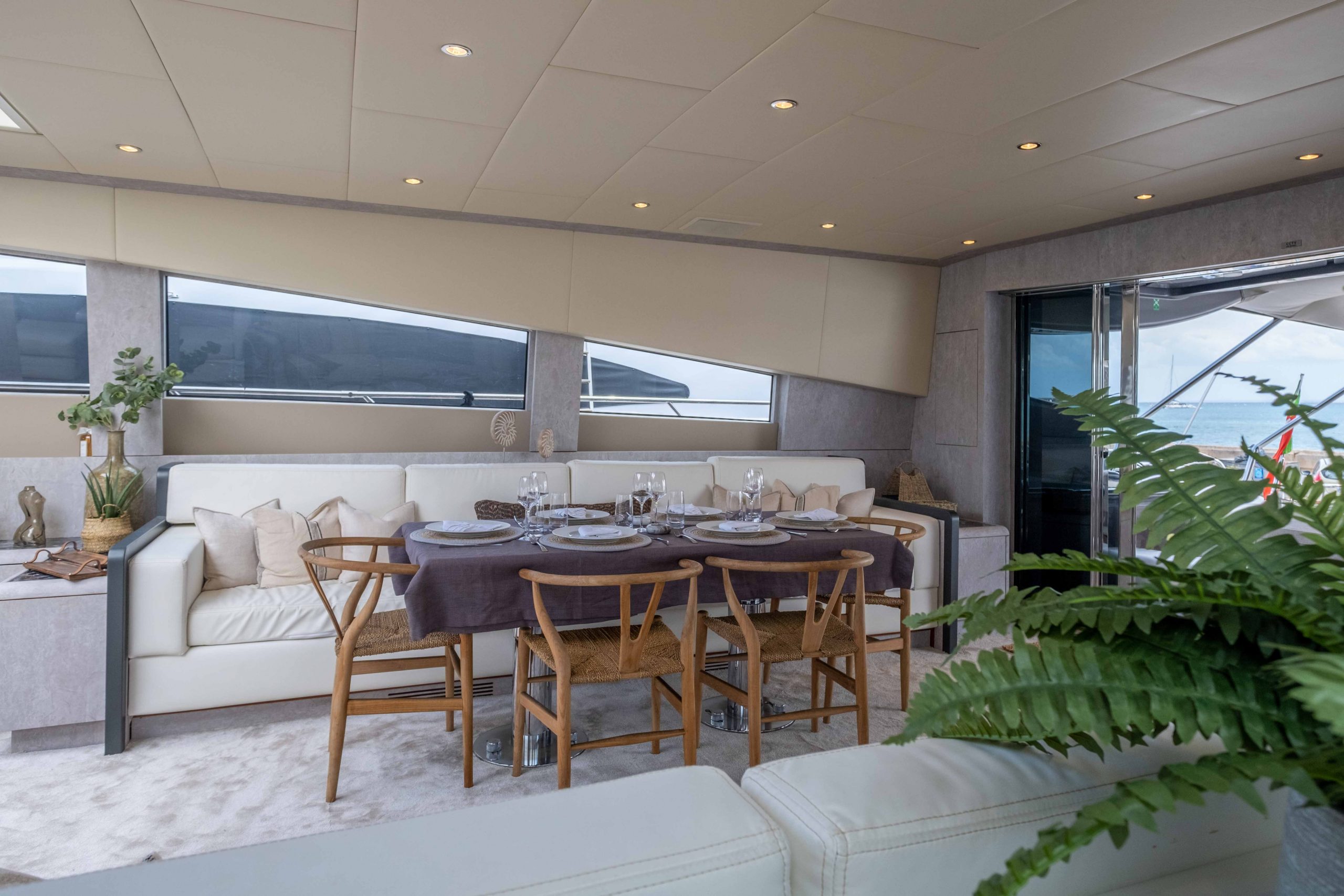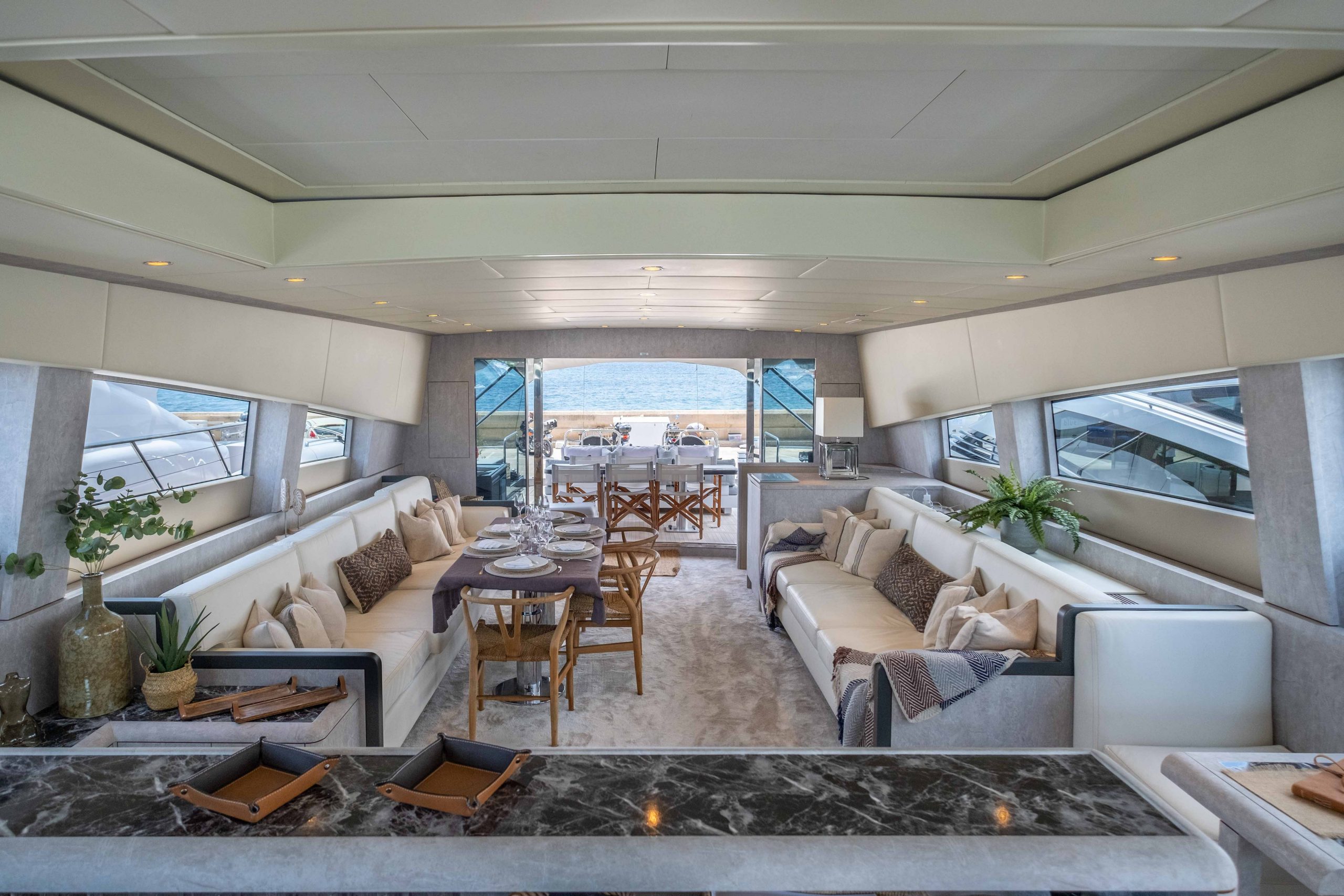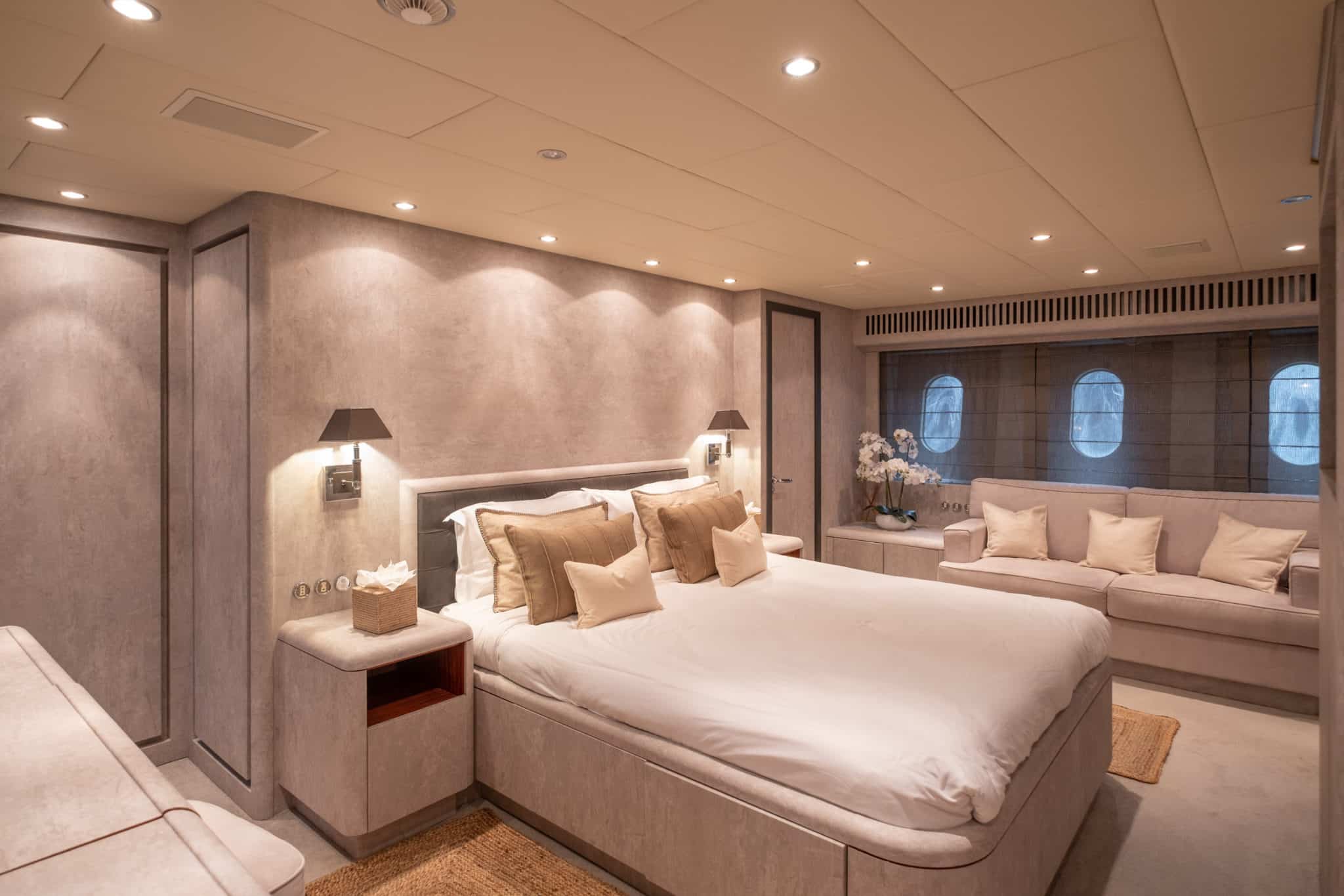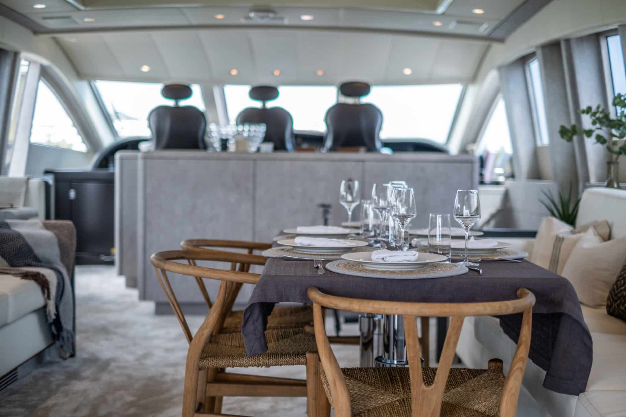 Outdoor living aboard DARK KNIGHT is truly exceptional. Expansive sunbeds at the bow and stern invite guests to soak up the sun, while shaded seating areas provide the perfect setting for social moments. From alfresco lunches to sunset drinks, every space is designed for enjoyment.