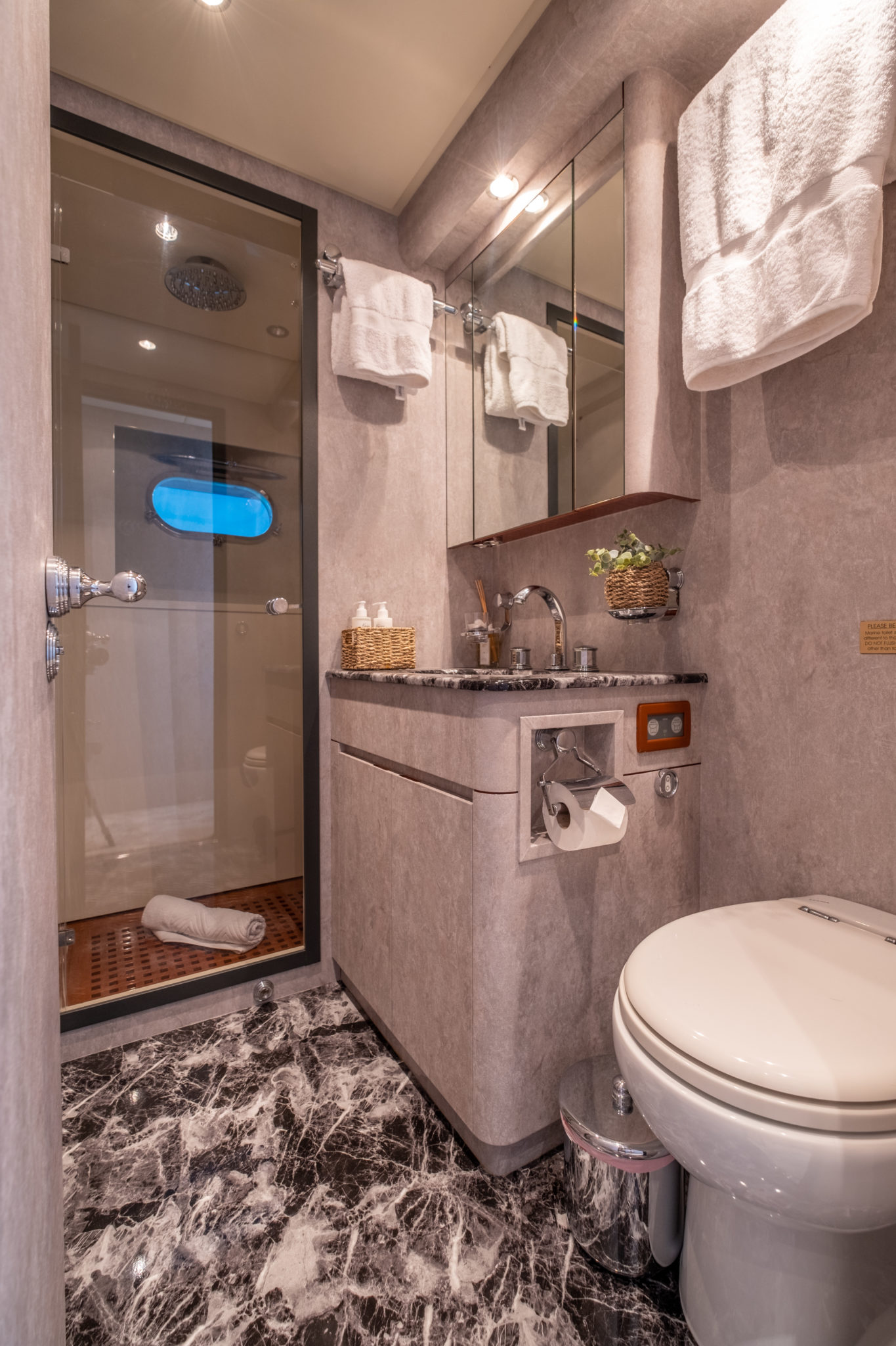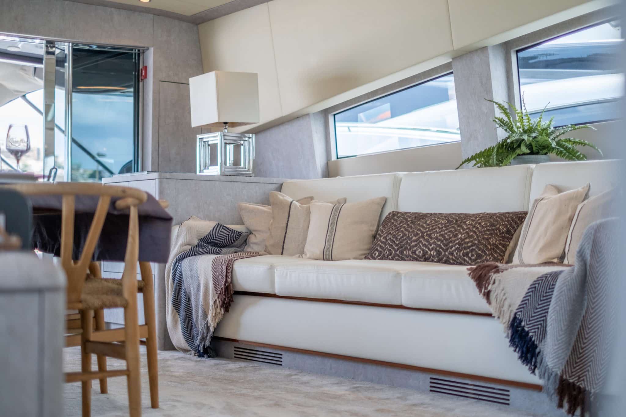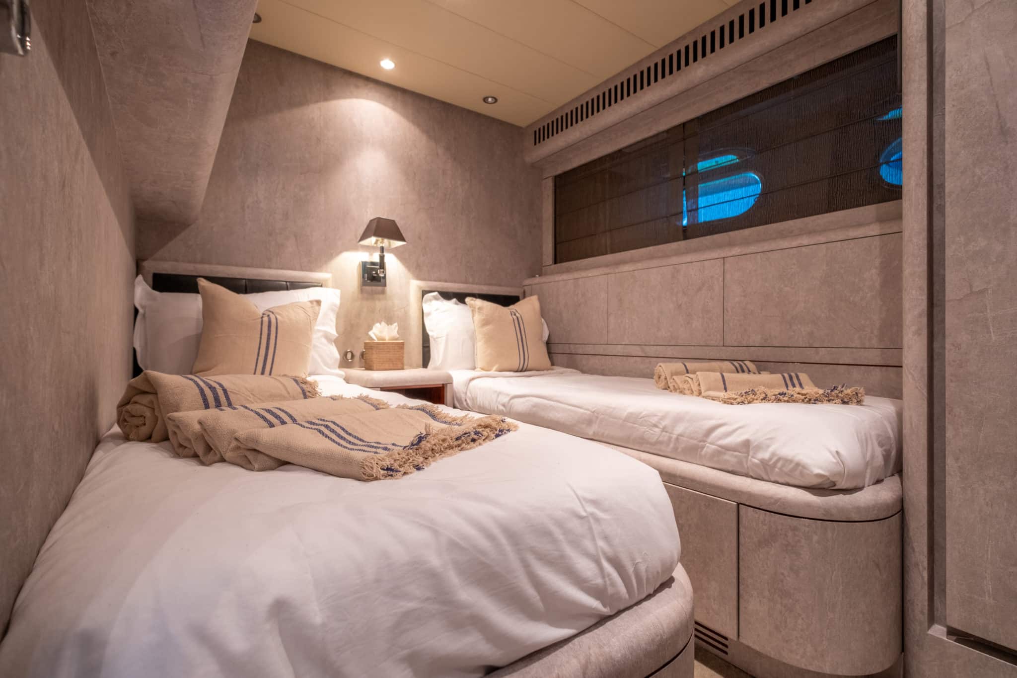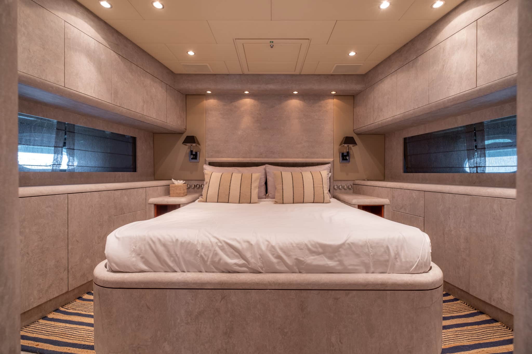 Inside, DARK KNIGHT reveals a contemporary haven of comfort. The open-plan salon is bright and welcoming, while the accommodation includes a full-beam Master suite, a VIP cabin, a double cabin, and a twin cabin with an additional Pullman berth. Each cabin features its own en-suite bathroom, offering privacy and a relaxed home-at-sea ambiance.