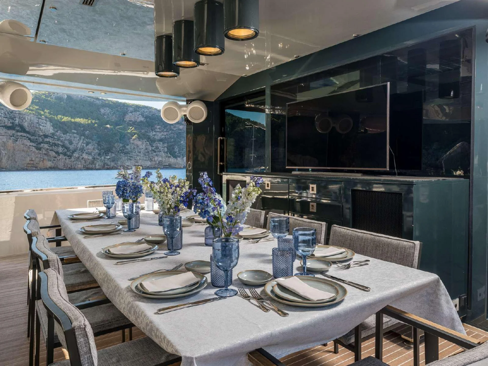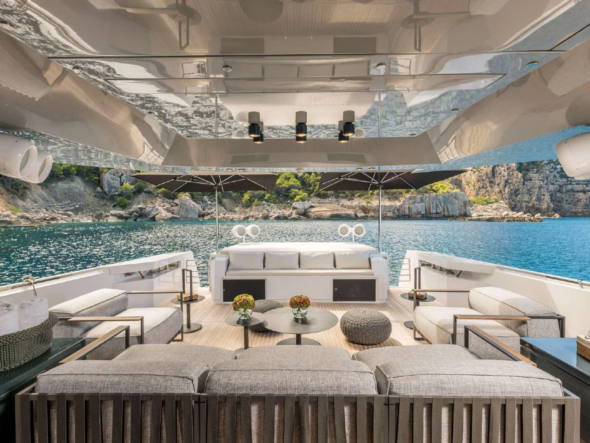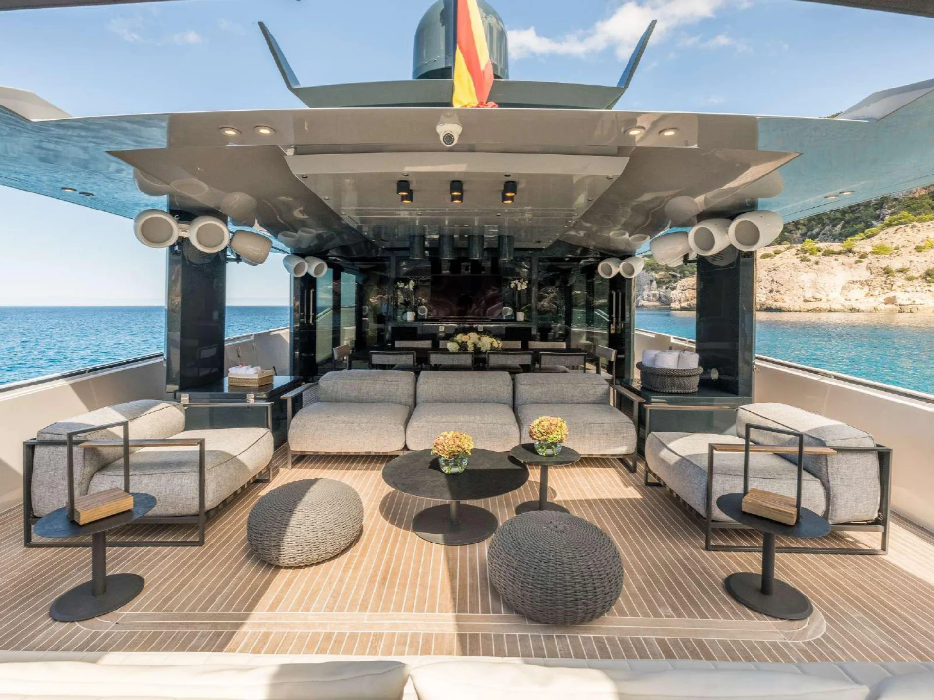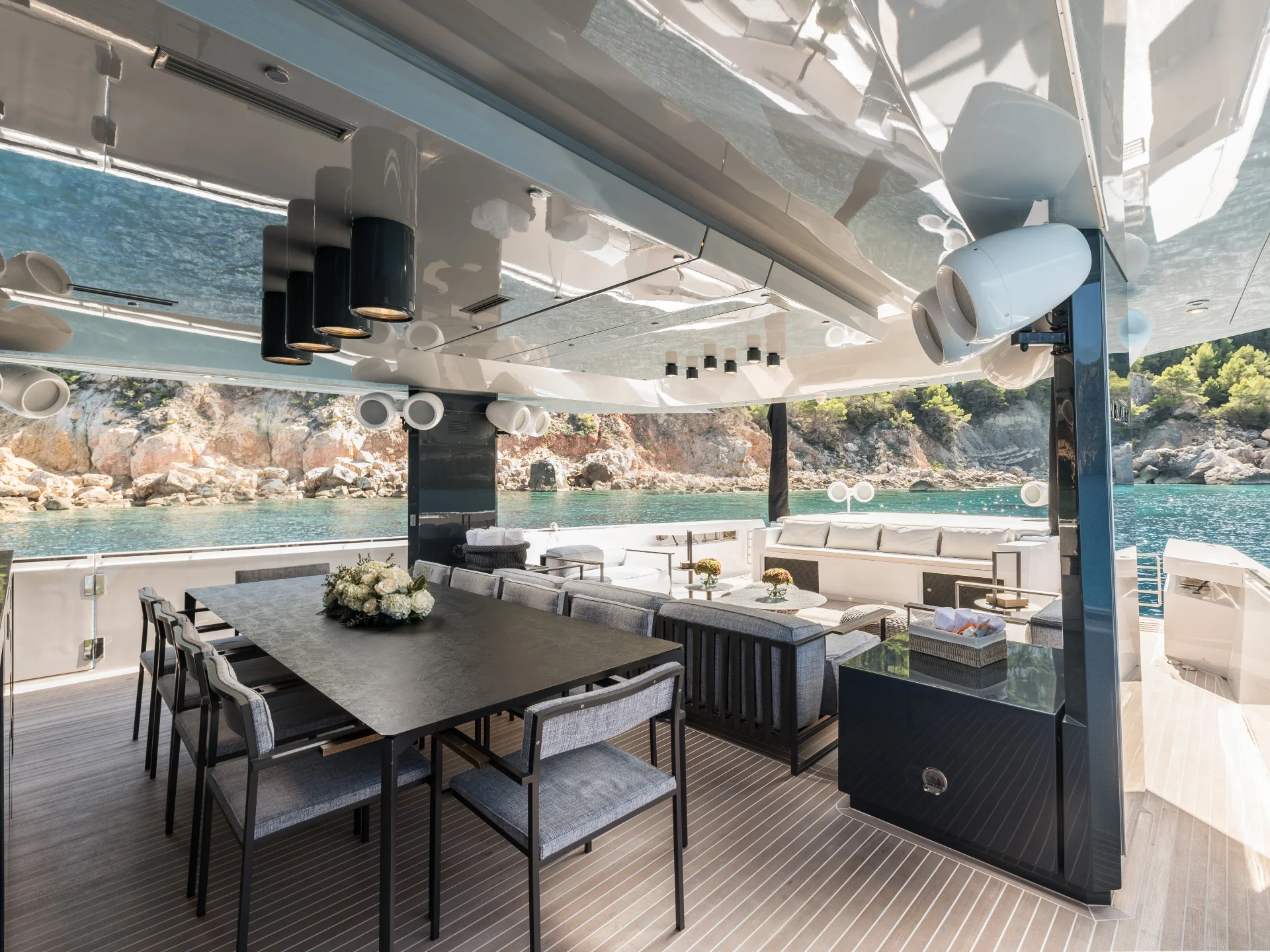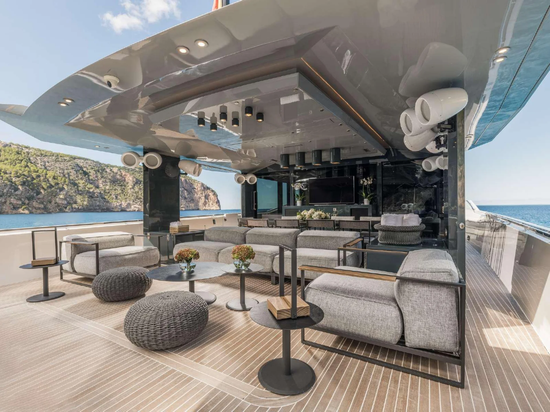 Outdoor living is a defining element of DHAMMA II’s design. Her expansive aft deck is conceived as a floating terrace, furnished with generous sofas, sofa beds, and a large dining table, perfect for long alfresco lunches or relaxed evenings at anchor. Forward, the yacht offers a newly designed top solarium, enhancing guest flow and creating additional space for sunbathing and relaxation with open sea views.