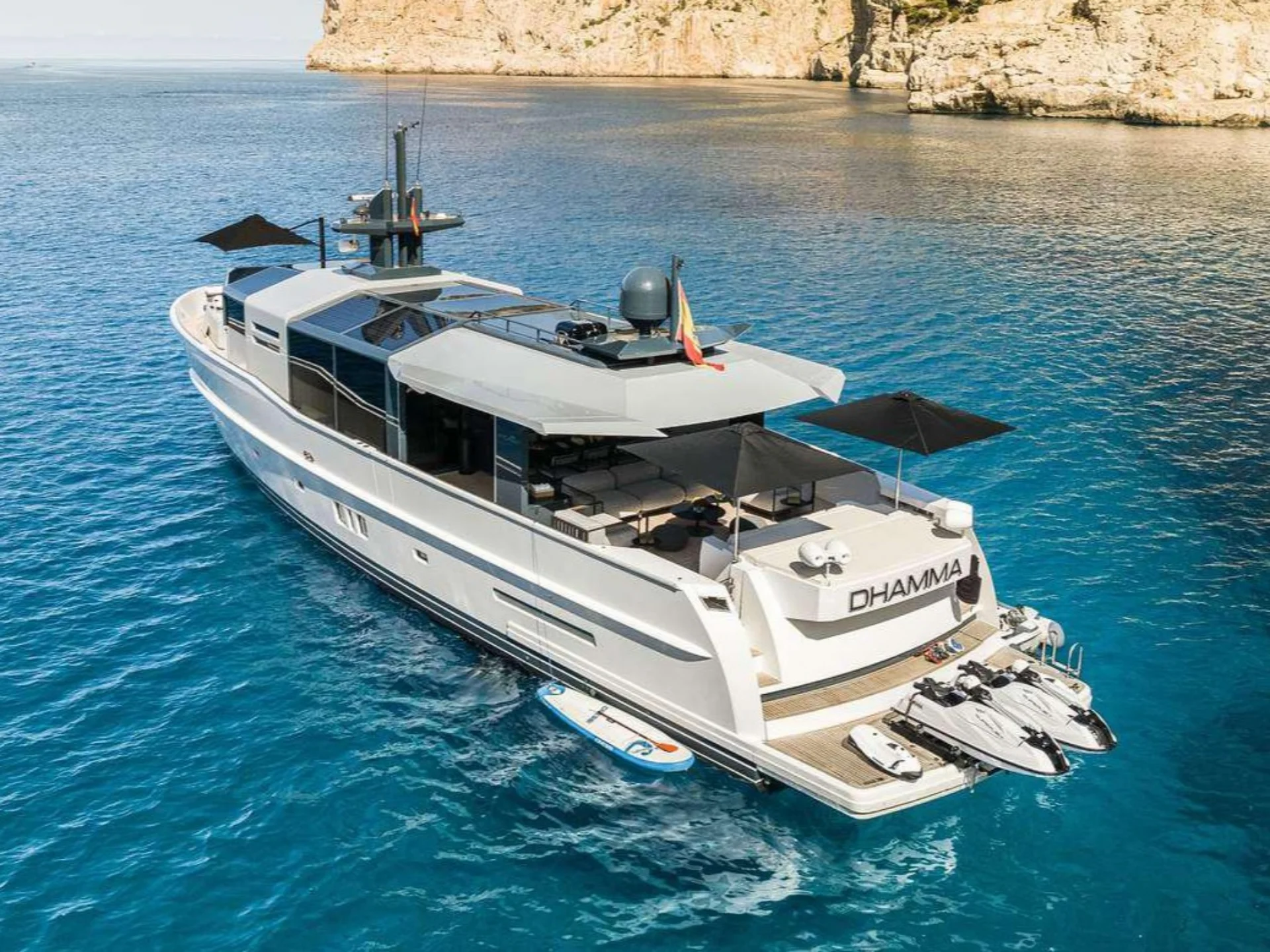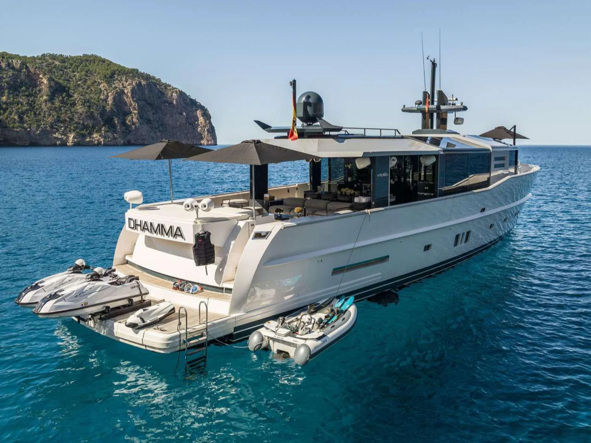 DHAMMA II is an exceptional Arcadia 85 motor yacht available for charter in the Balearic Islands, offering a distinctive combination of contemporary luxury, innovative design, and environmentally conscious technology. Built by the award-winning Italian shipyard Arcadia and extensively updated with major refits in 2023 and 2024, she presents a fresh and forward-thinking approach to modern yachting.