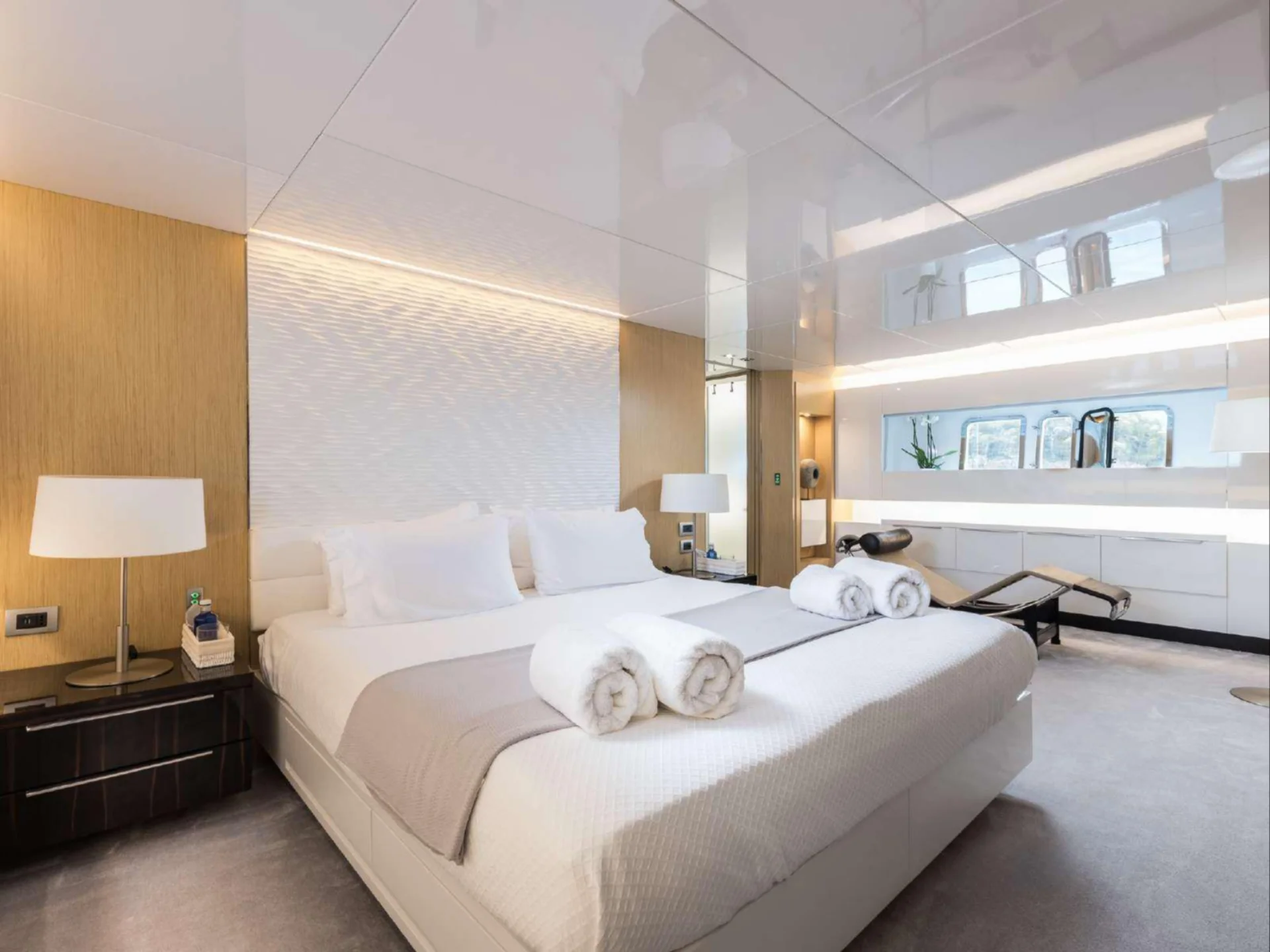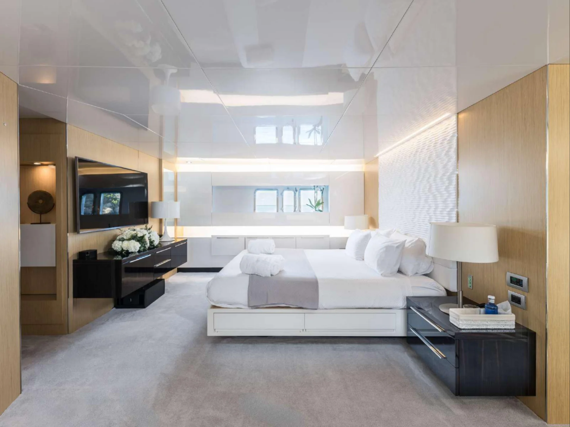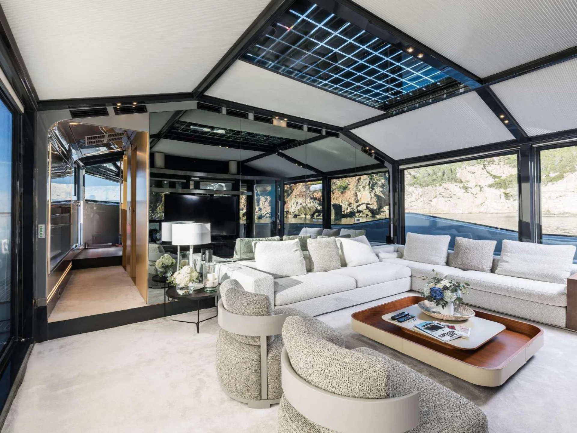 Inside, DHAMMA II features a bright and welcoming interior designed around natural light and relaxed sophistication. The main salon is enhanced by the yacht’s signature double-glazed Jardin d’Hiver, a unique Arcadia feature that creates an all-season living space while maintaining uninterrupted views of the surrounding seascape. Accommodation is arranged across four well-appointed cabins, highlighted by an exceptional 32 m² Master cabin equipped with a private wellness area, alongside a VIP cabin with a queen bed and two twin cabins with additional Pullman berths, offering flexible and comfortable accommodation for guests on board.