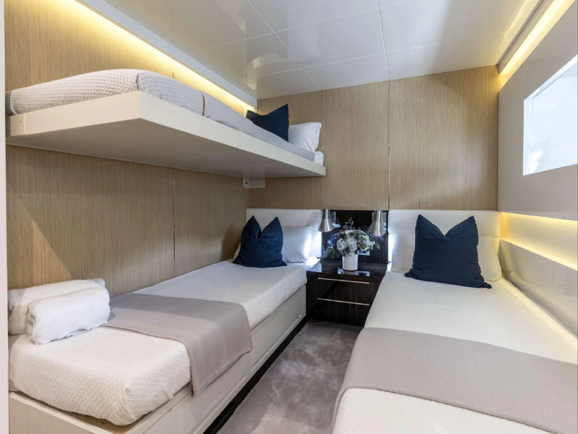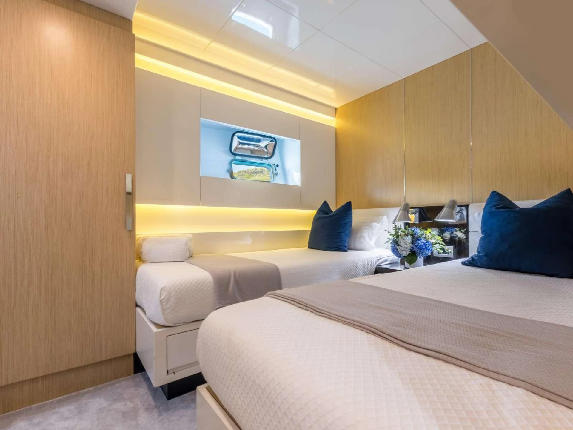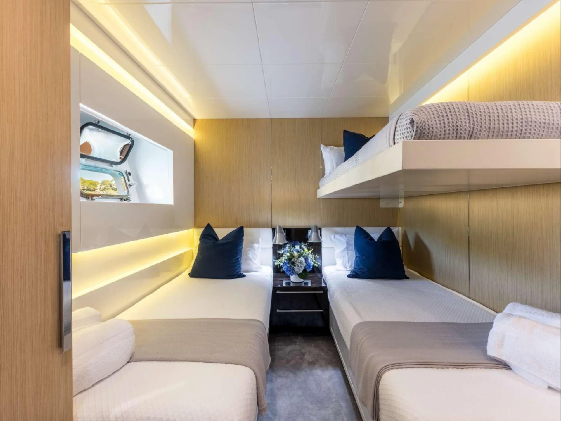 Inside, DHAMMA II features a bright and welcoming interior designed around natural light and relaxed sophistication. The main salon is enhanced by the yacht’s signature double-glazed Jardin d’Hiver, a unique Arcadia feature that creates an all-season living space while maintaining uninterrupted views of the surrounding seascape. Accommodation is arranged across four well-appointed cabins, highlighted by an exceptional 32 m² Master cabin equipped with a private wellness area, alongside a VIP cabin with a queen bed and two twin cabins with additional Pullman berths, offering flexible and comfortable accommodation for guests on board.