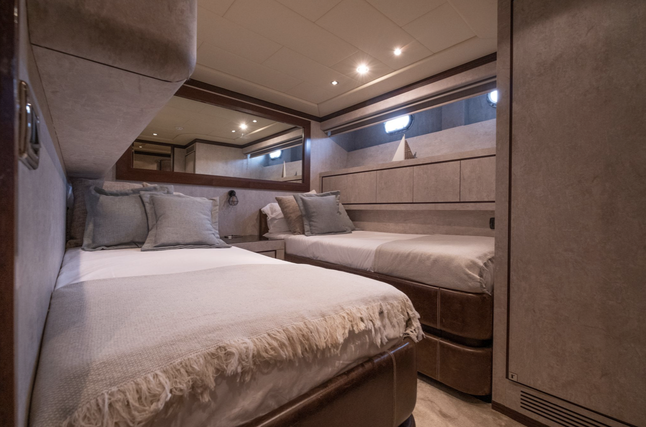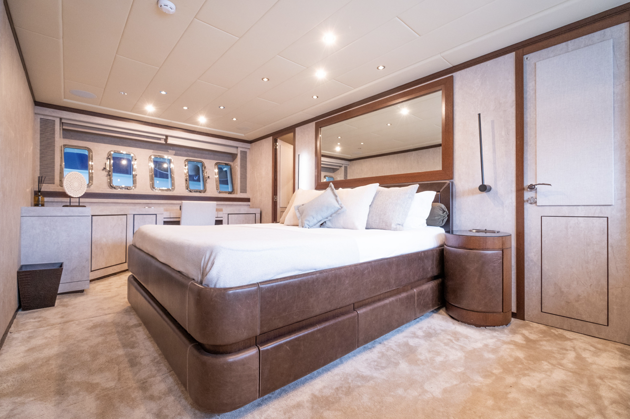 Inside, DRIFT offers a warm, elegant interior designed for comfort at sea. The salon feels inviting and contemporary, while the accommodation includes a master suite with a private sauna, a VIP cabin, a twin cabin, and a single cabin, with the option to convert the small salon for additional sleeping space. Each cabin benefits from en-suite facilities, ensuring privacy and relaxation.