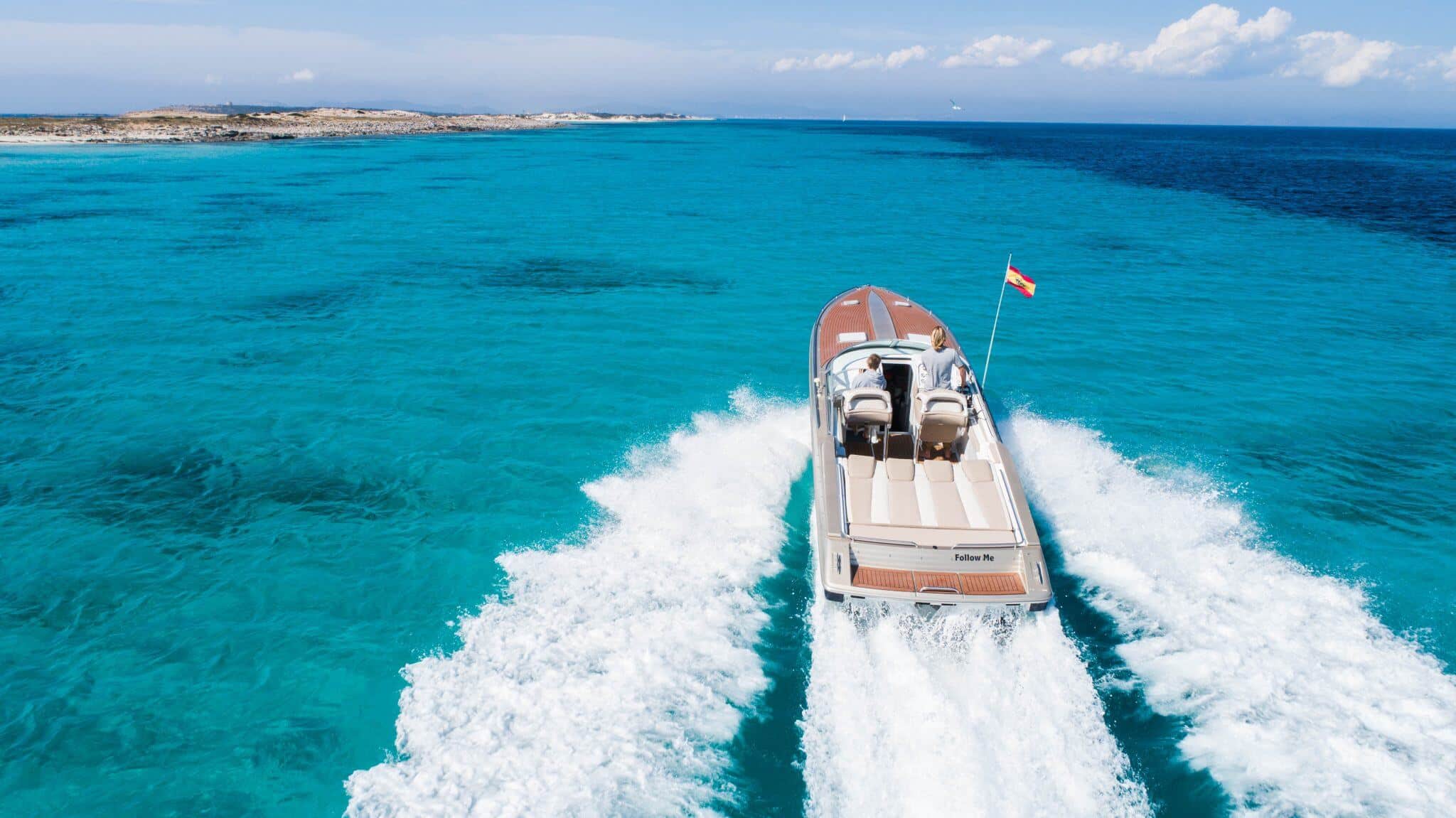FOLLOW ME is a sporty Formula yacht that combines lively performance with relaxed comfort. With her sleek profile and modern styling, she is a great choice for guests who enjoy stylish coastal cruising. FOLLOW ME offers a fun and easy way to discover Ibiza and Formentera by sea.