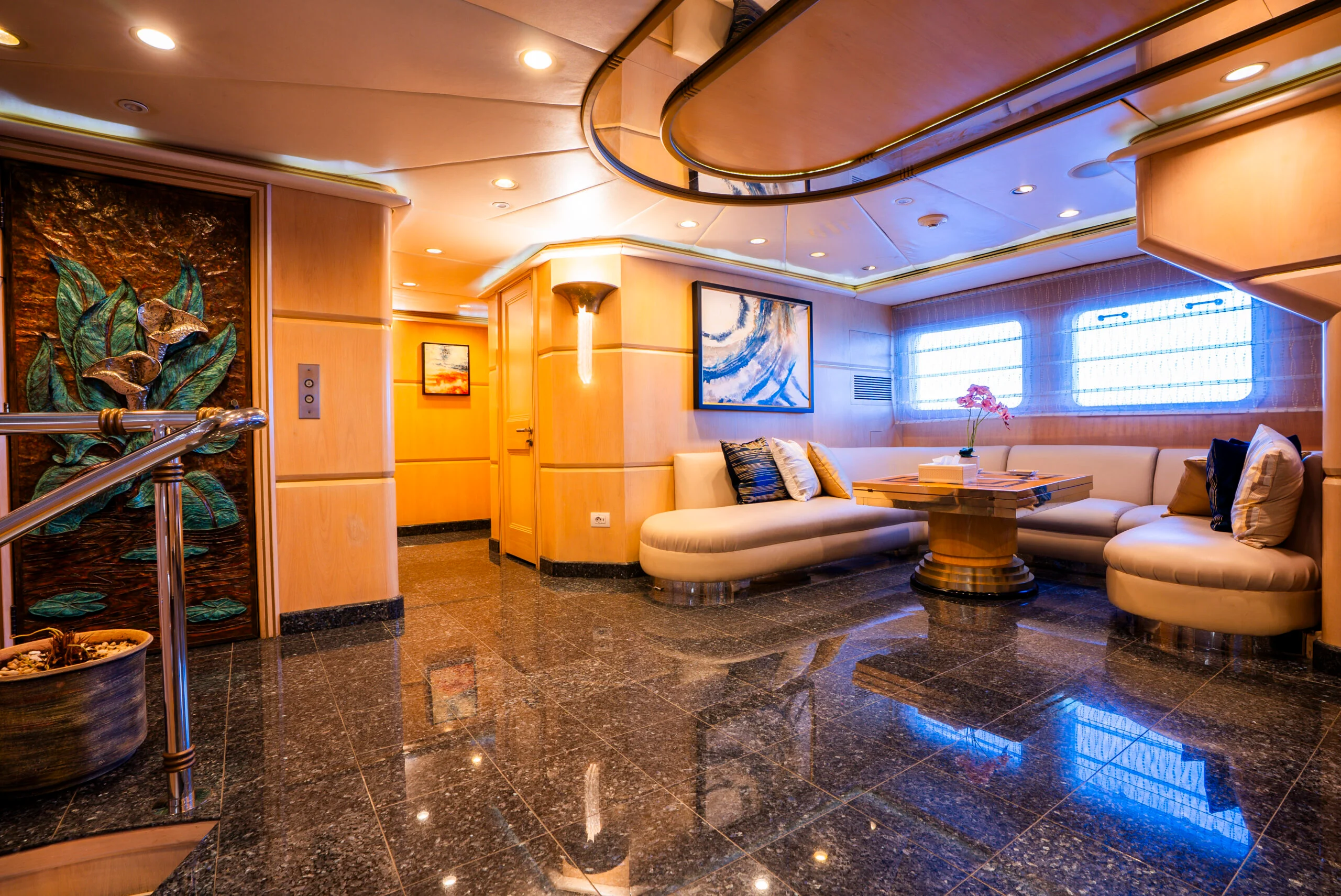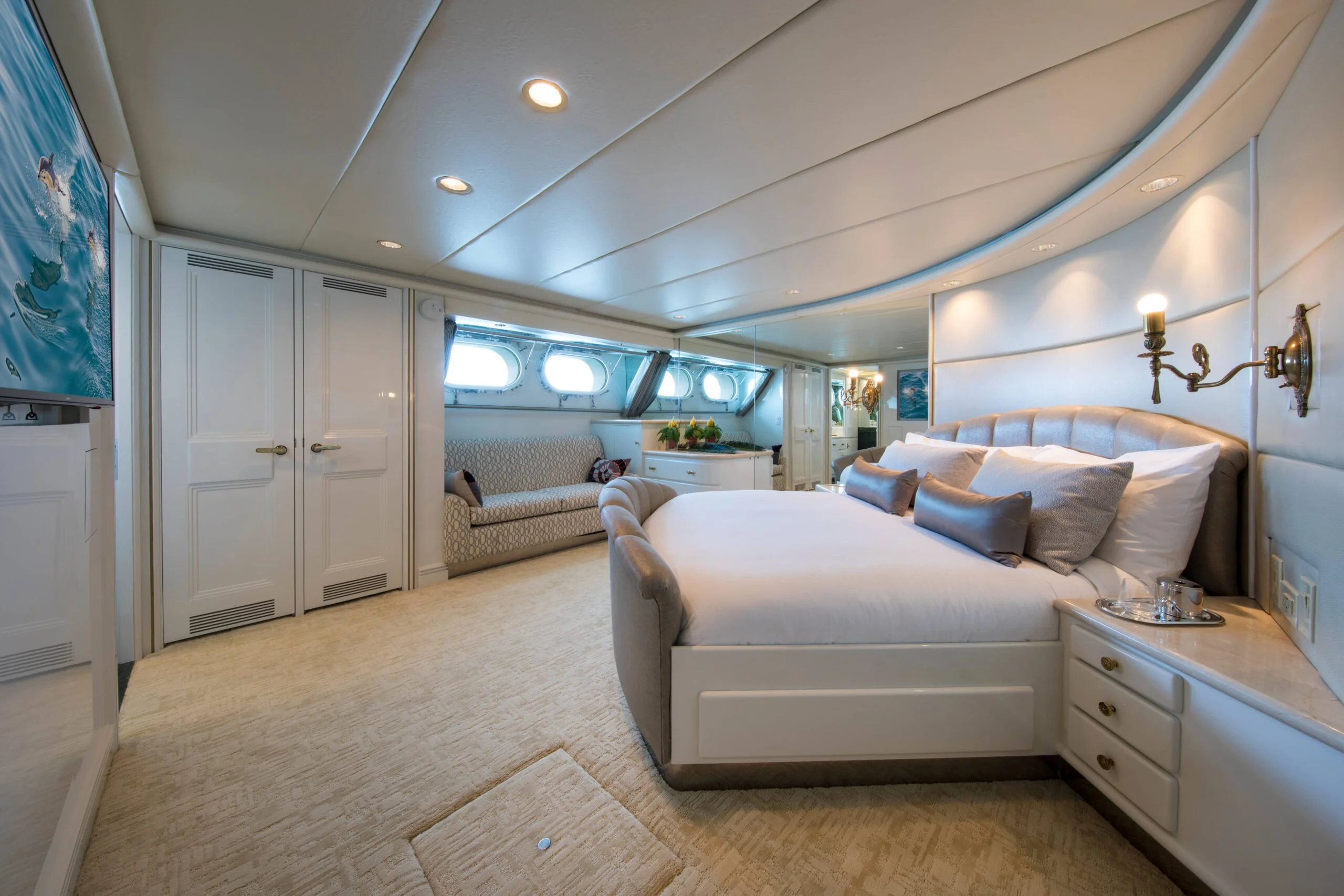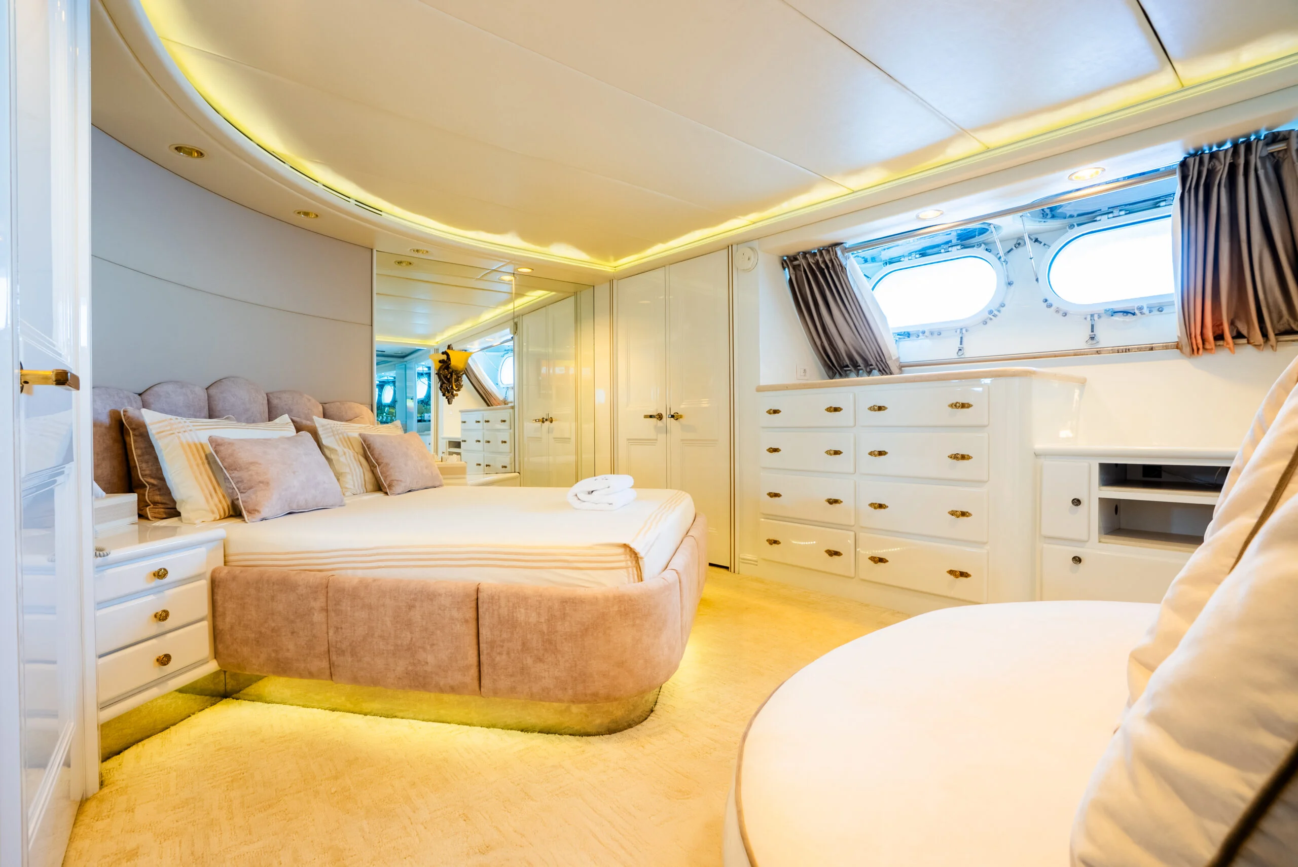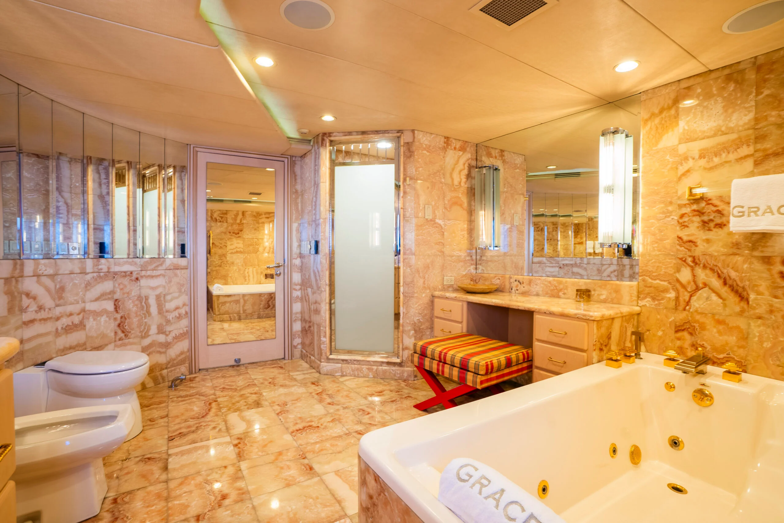 Inside, GRACE showcases beautifully appointed interiors that balance elegance and comfort. The accommodation is arranged across six suites, including a stunning master suite along with double and twin cabins. Each space is thoughtfully designed to provide guests with privacy and a serene onboard atmosphere.