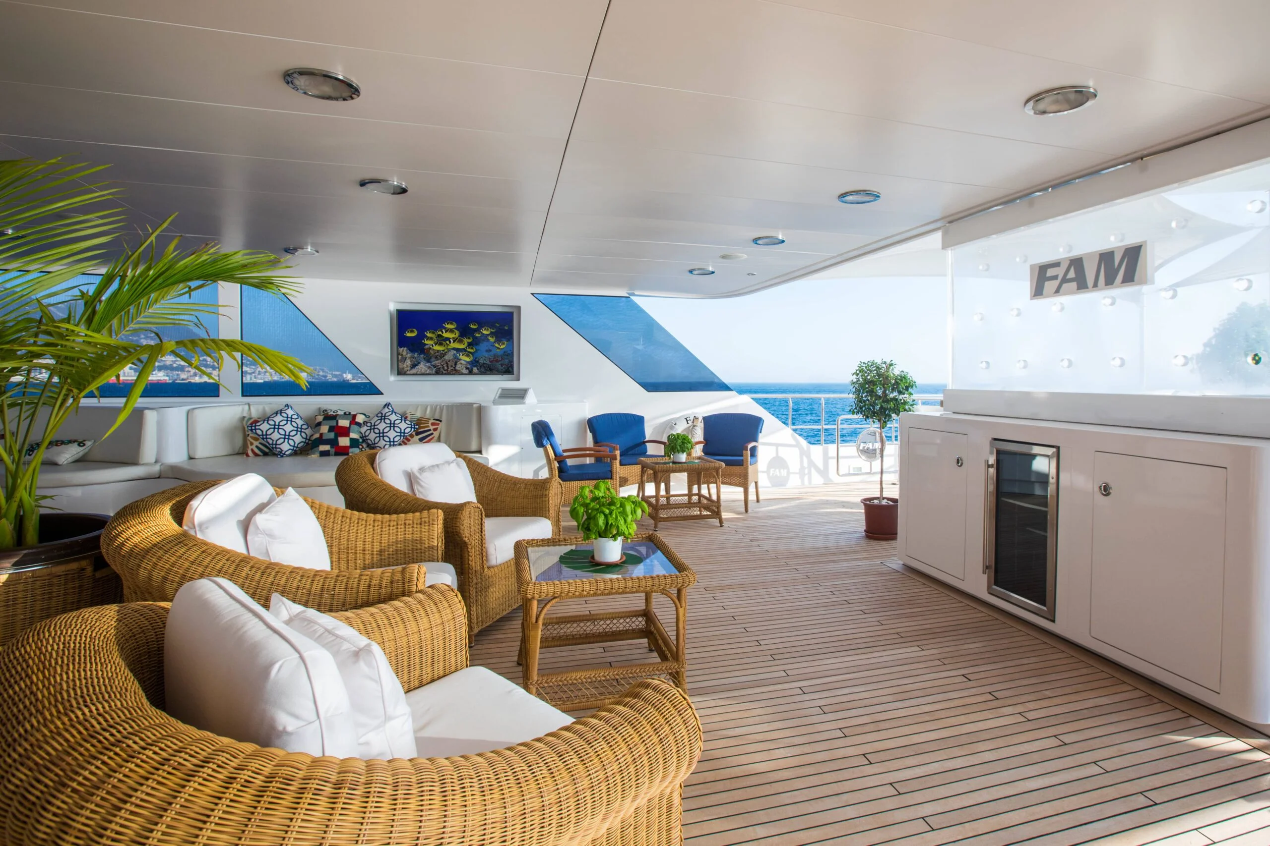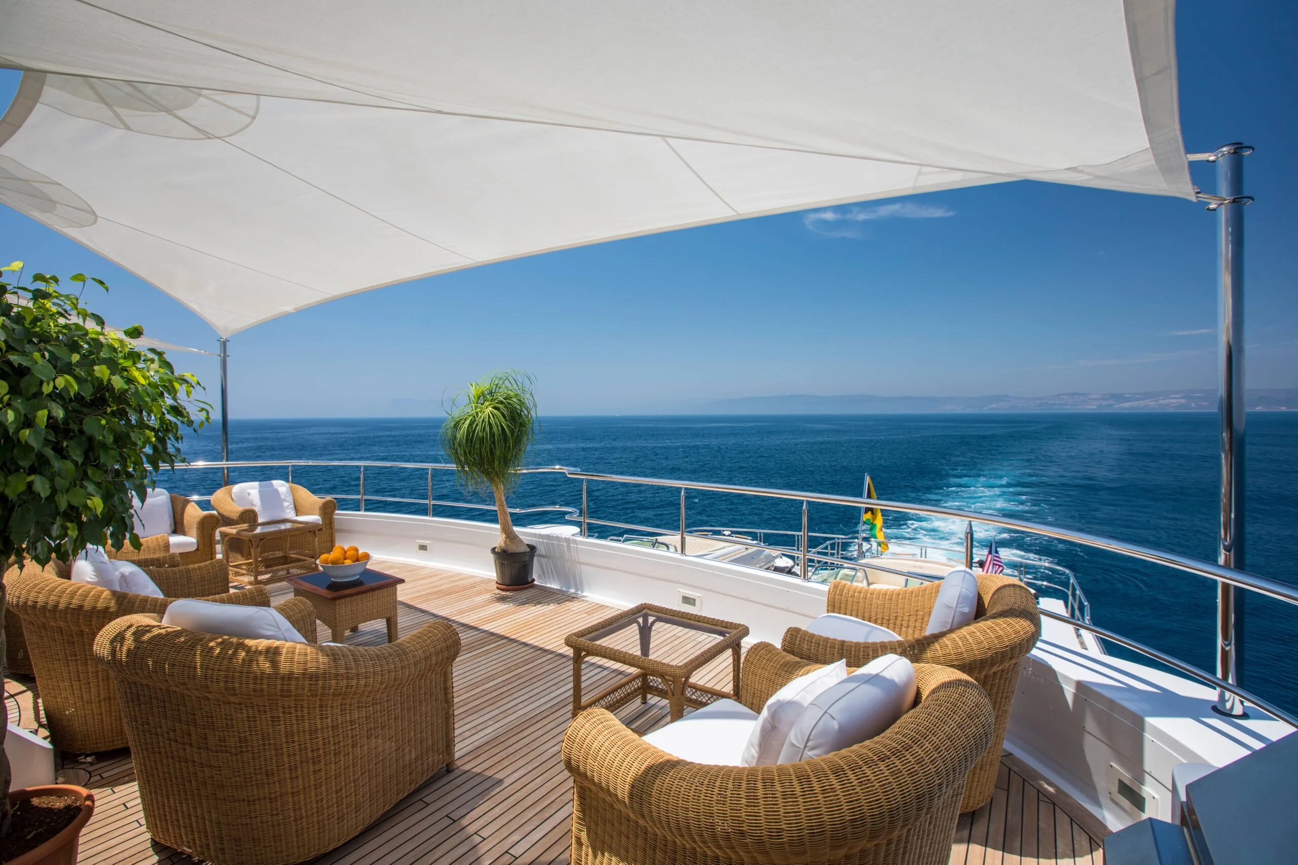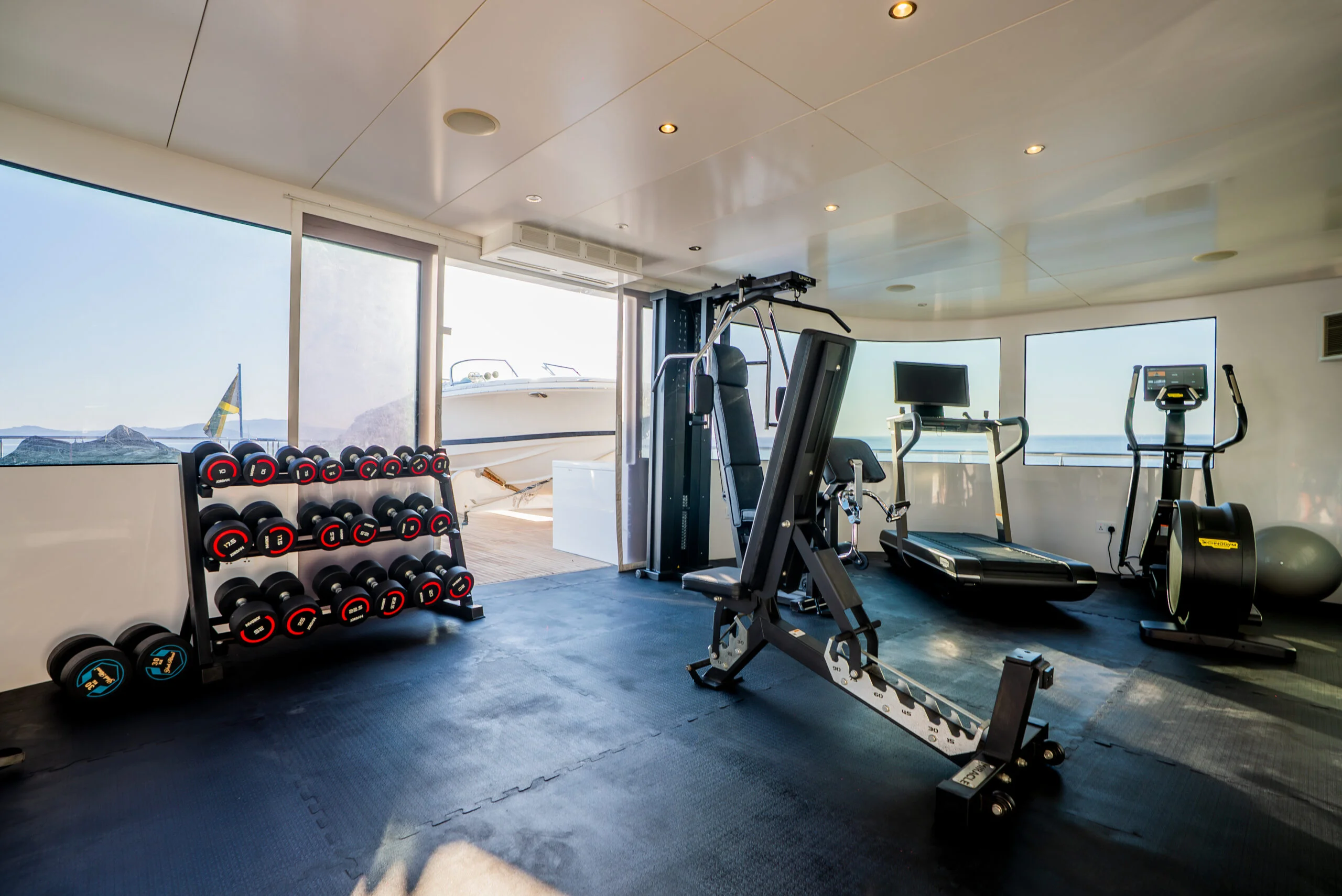Outdoor living aboard GRACE is designed for pure enjoyment. Expansive deck areas provide elegant spaces for sunbathing, socializing, and dining with panoramic sea views. Whether relaxing in the jacuzzi or keeping active in the onboard gym, the decks create a refined setting for open-air living at sea.