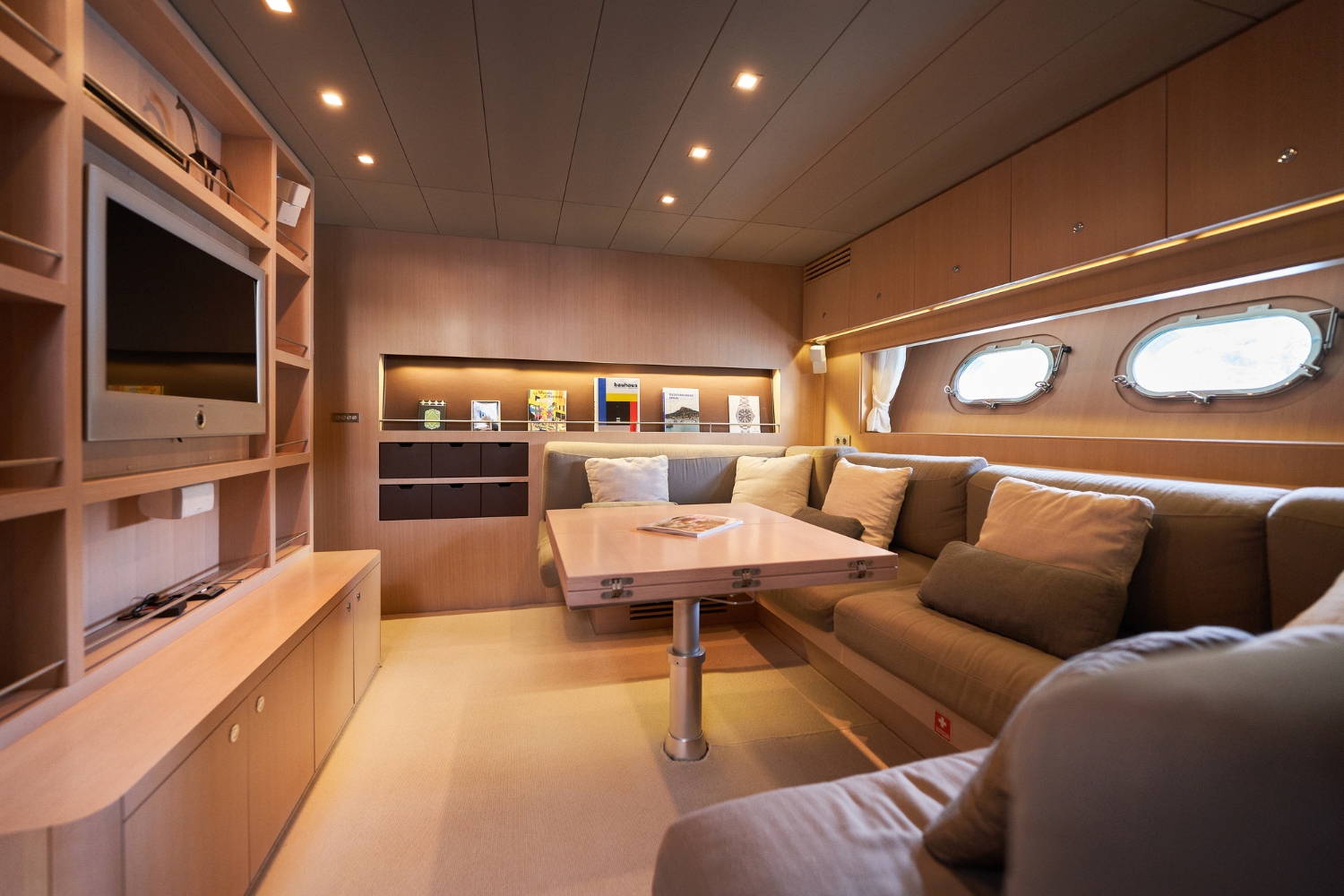 Inside, MINTAKA features a contemporary interior with comfortable lounge areas and a relaxed atmosphere. The salon provides a welcoming space to unwind indoors, while the layout ensures practical comfort for time spent on board between destinations.