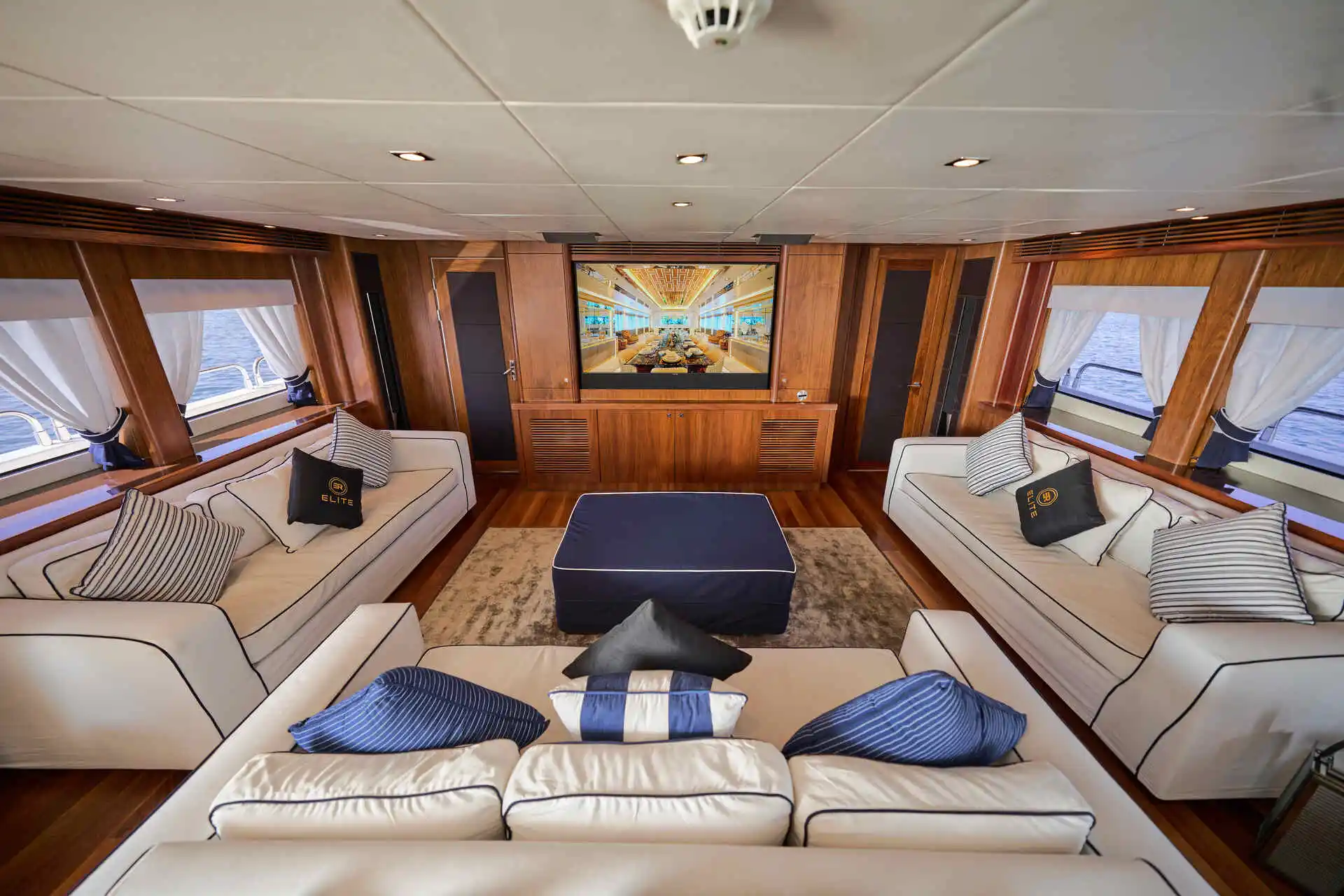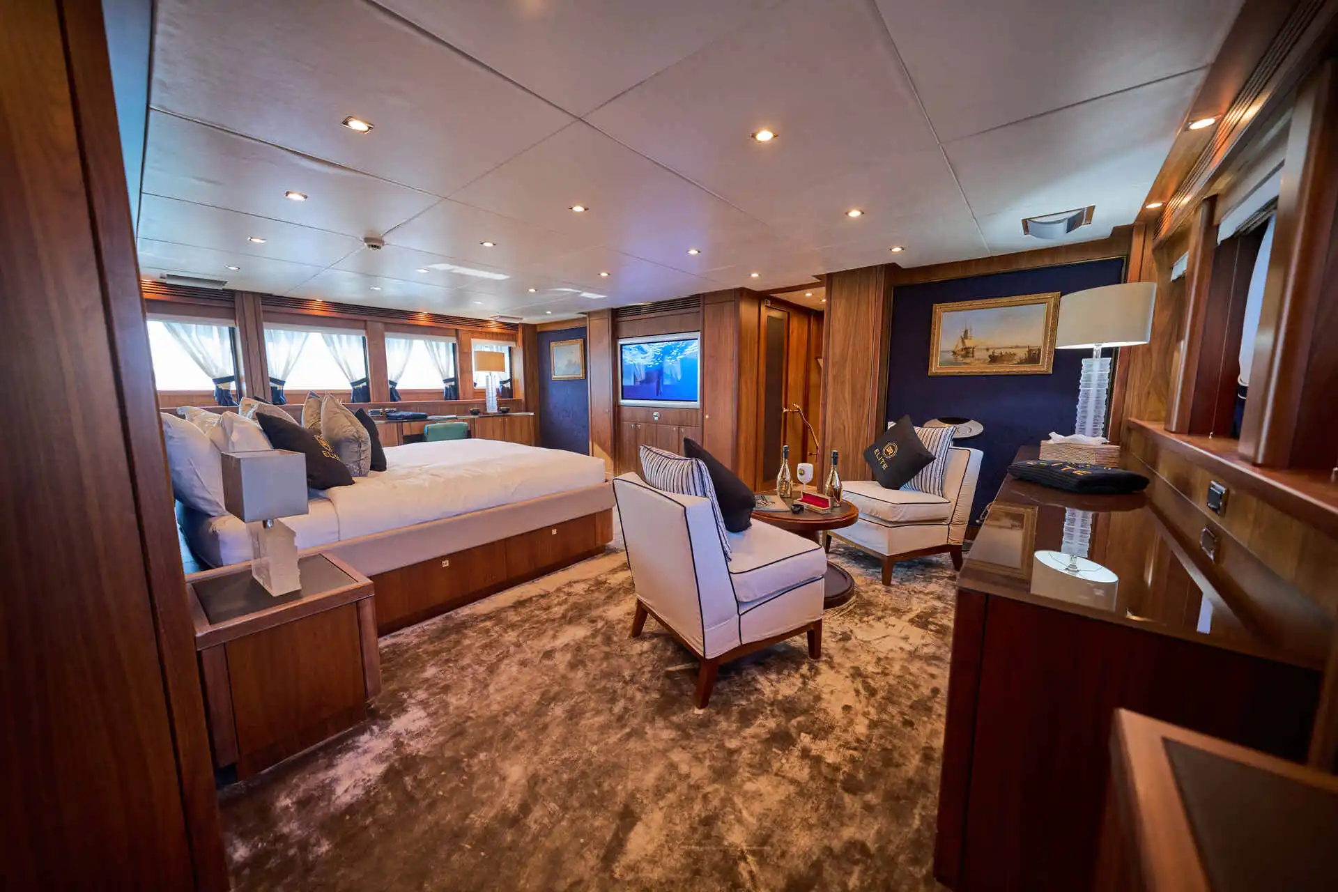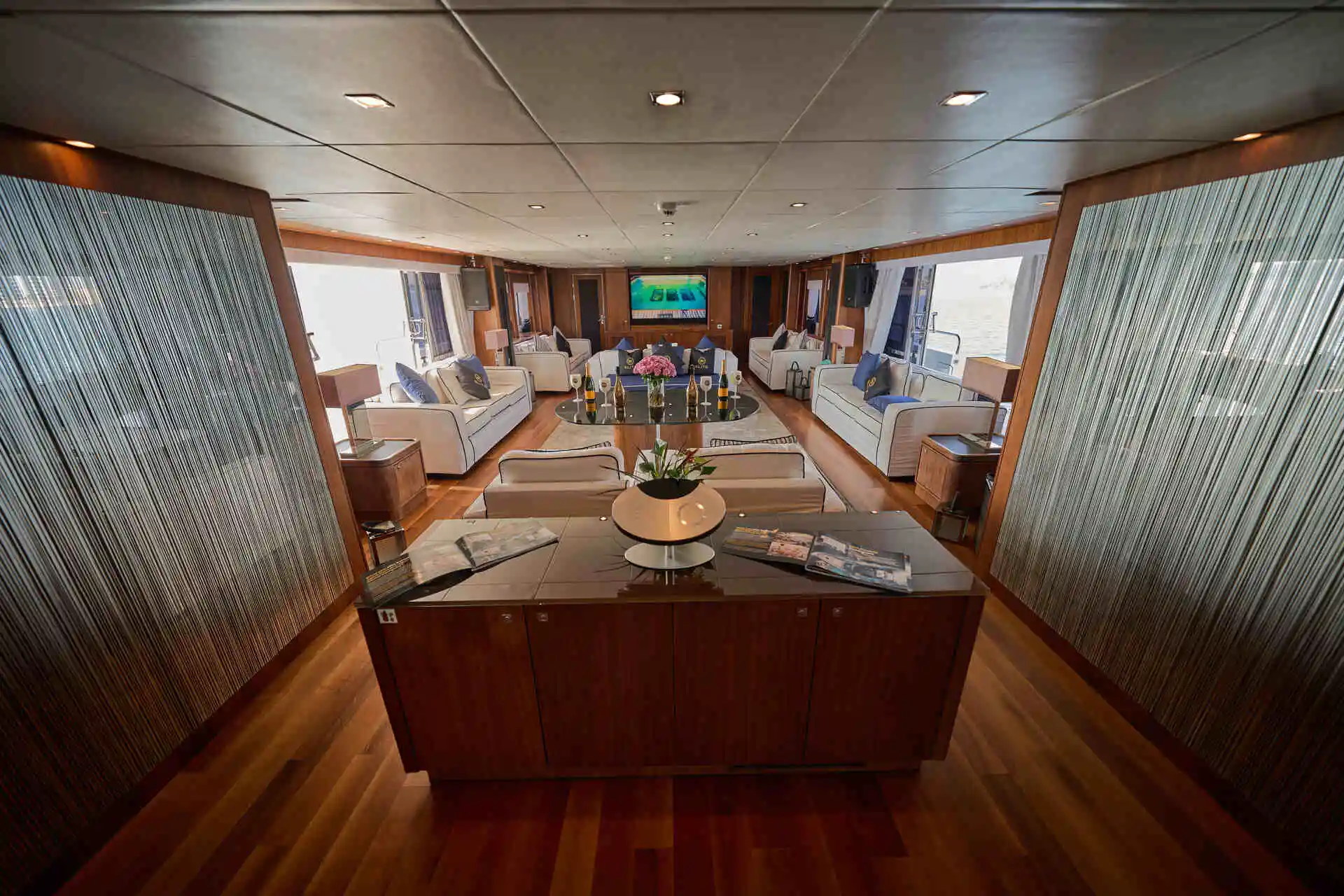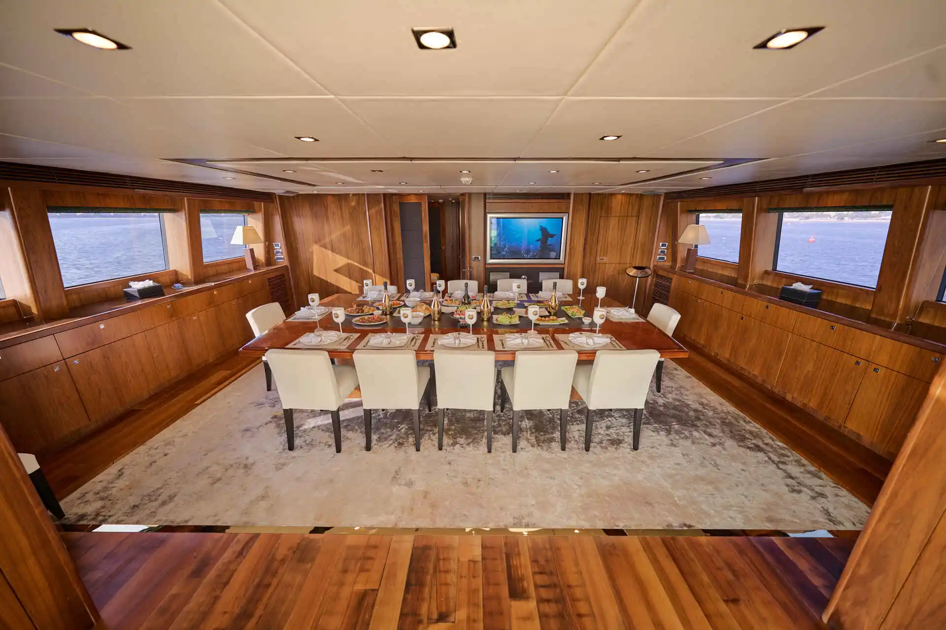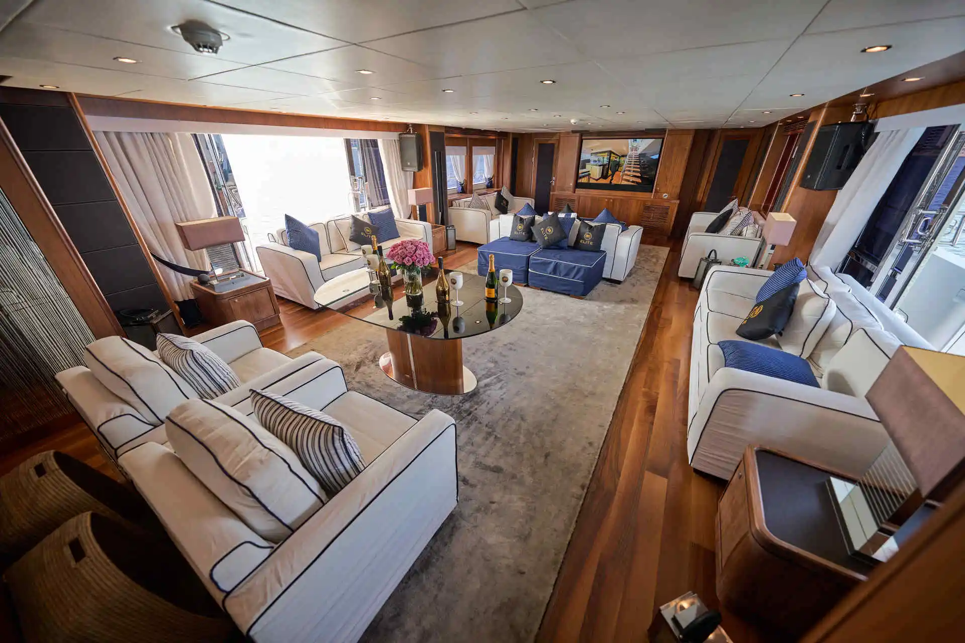 Inside, the yacht offers generous and well-designed living spaces finished with elegant materials and abundant natural light. Large windows enhance the sense of space throughout the main salon, creating a comfortable and refined setting for time on board. The interior layout allows for both relaxed moments and more formal gatherings, making it well suited to a variety of charter experiences.