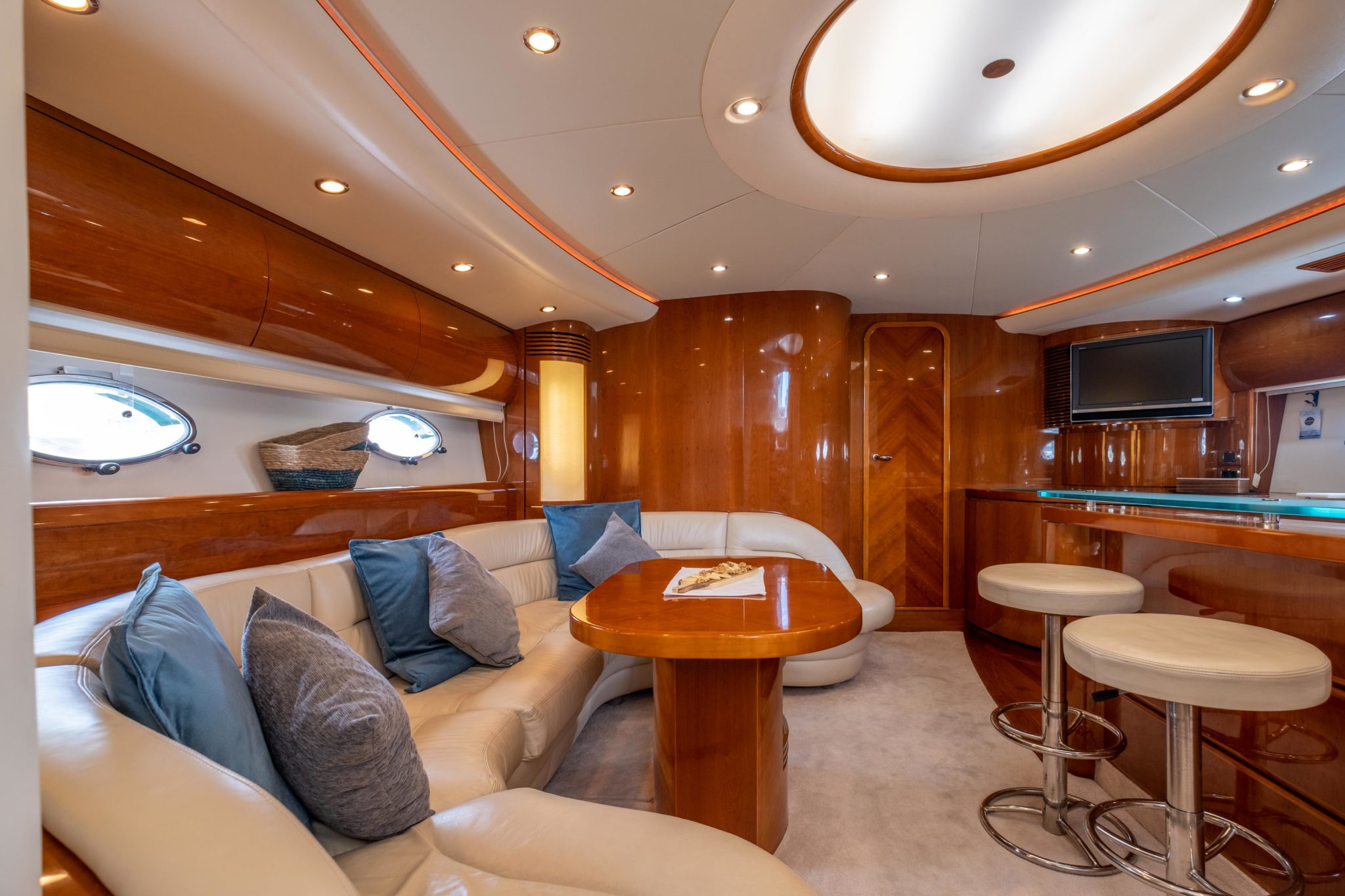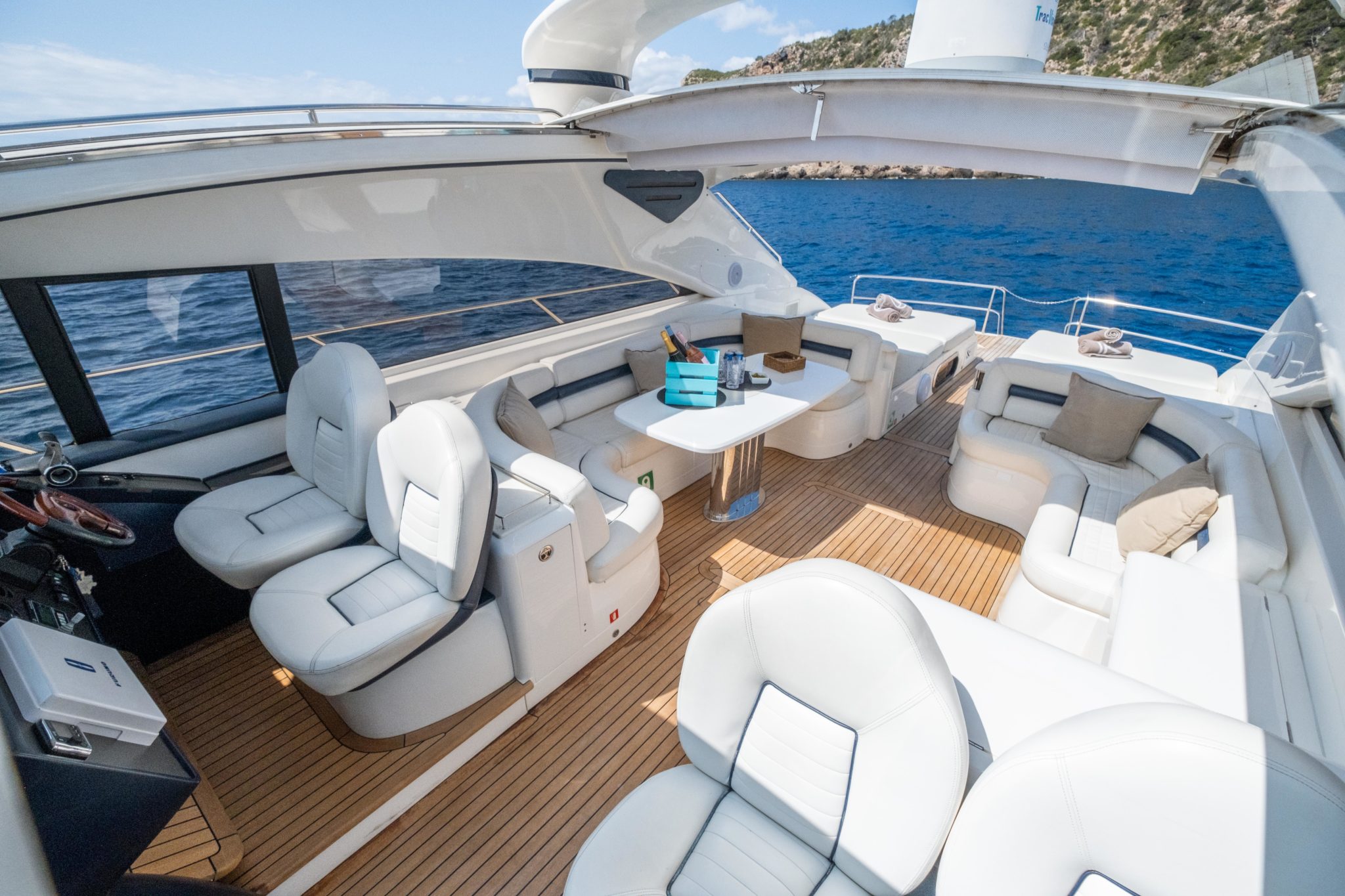 Outdoor living aboard PRINCESS JULIET is ideal for enjoying the Mediterranean lifestyle. Two generous sunbathing areas at the bow and stern invite guests to unwind, while the shaded dining and lounge area creates the perfect social space. The swim platform provides easy access to the water for refreshing dips.