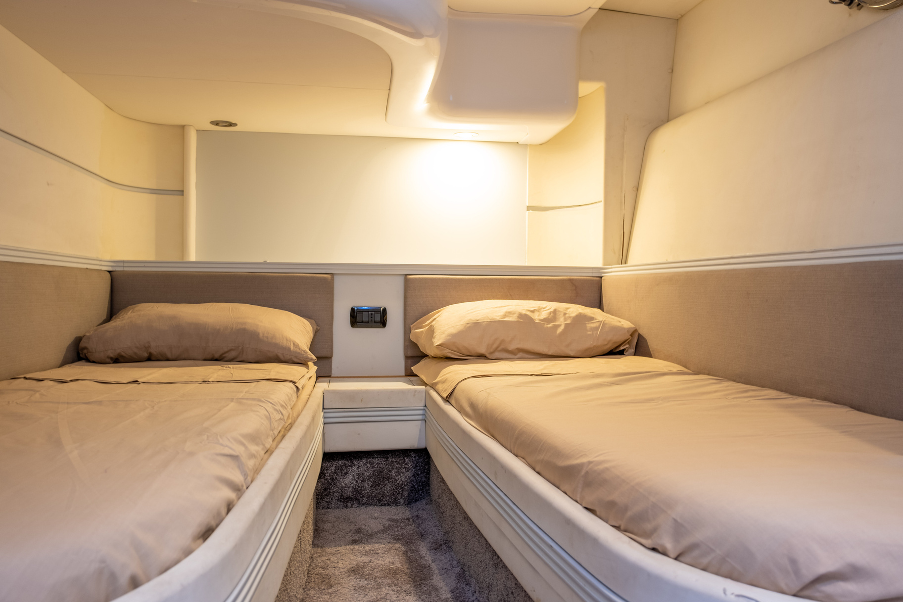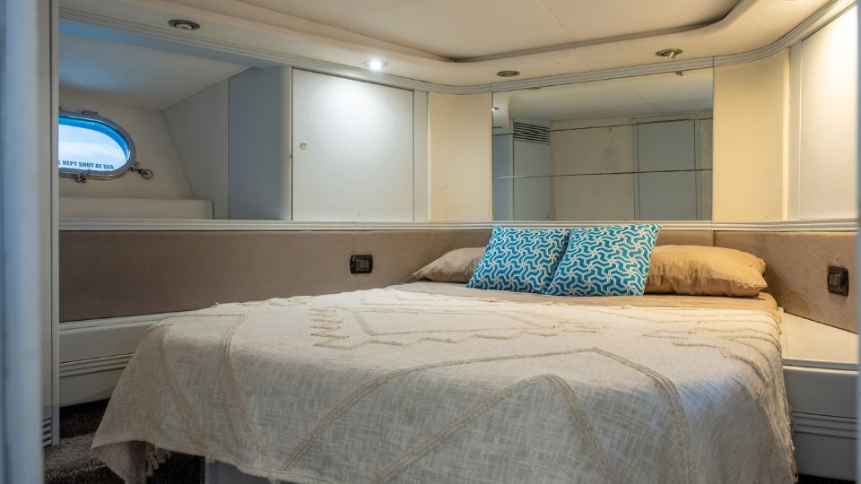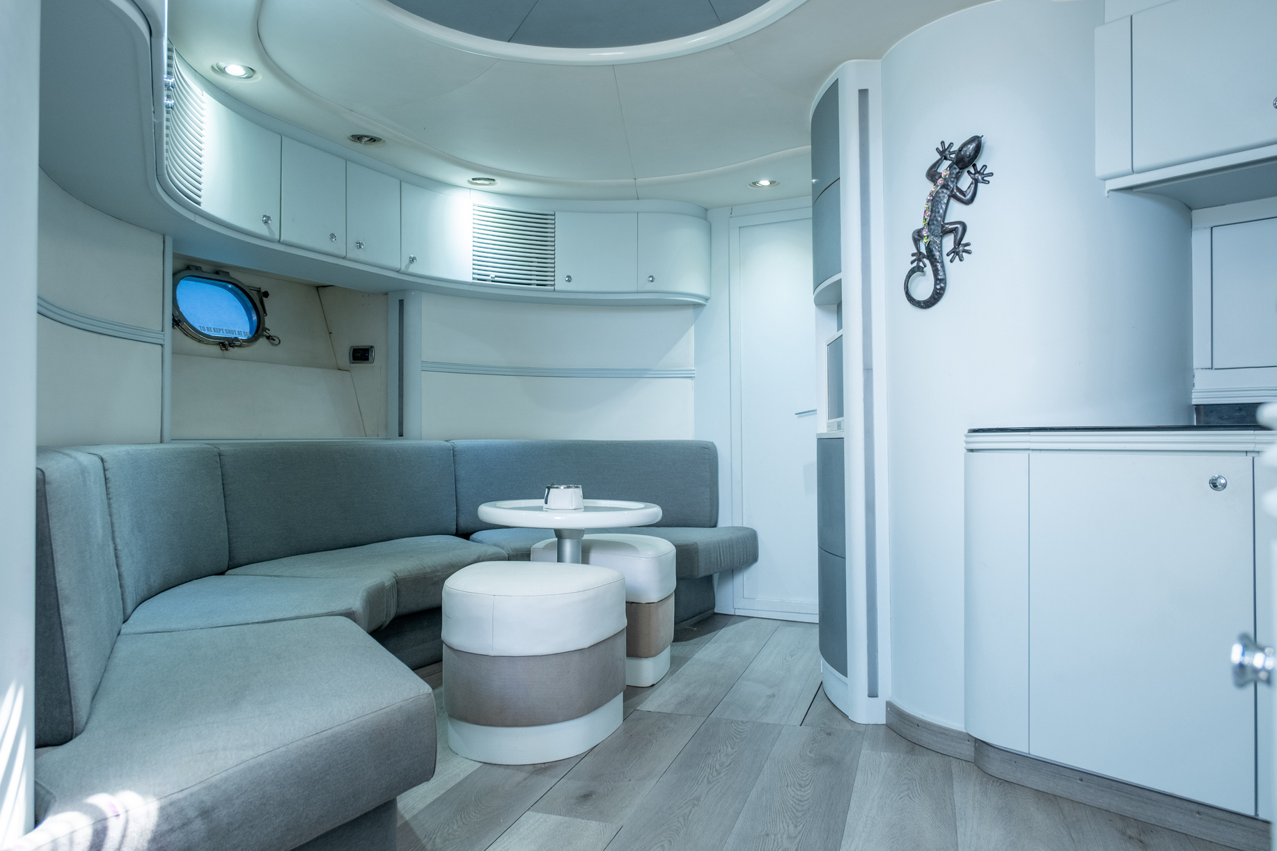 Inside, SURREAL features a modern and practical interior designed for relaxing between destinations. Accommodation is arranged across two cabins, providing a comfortable retreat after a day on the water.