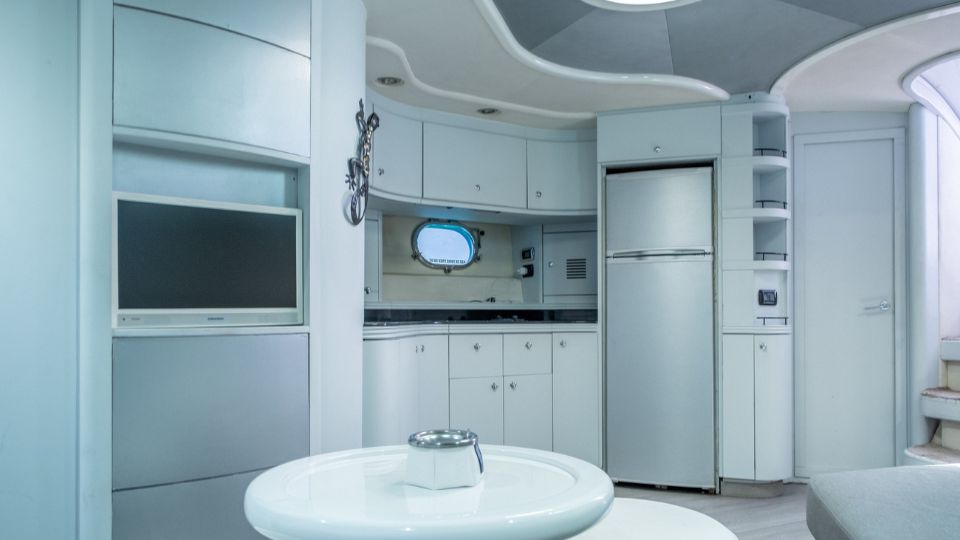 Outdoor areas are designed for enjoying Ibiza’s lifestyle at sea. Guests can relax on sunbathing areas, take in coastal views while cruising, or stop in secluded coves for a swim. Her performance allows easy access to multiple anchorages in a single day, maximising time spent enjoying the surroundings.