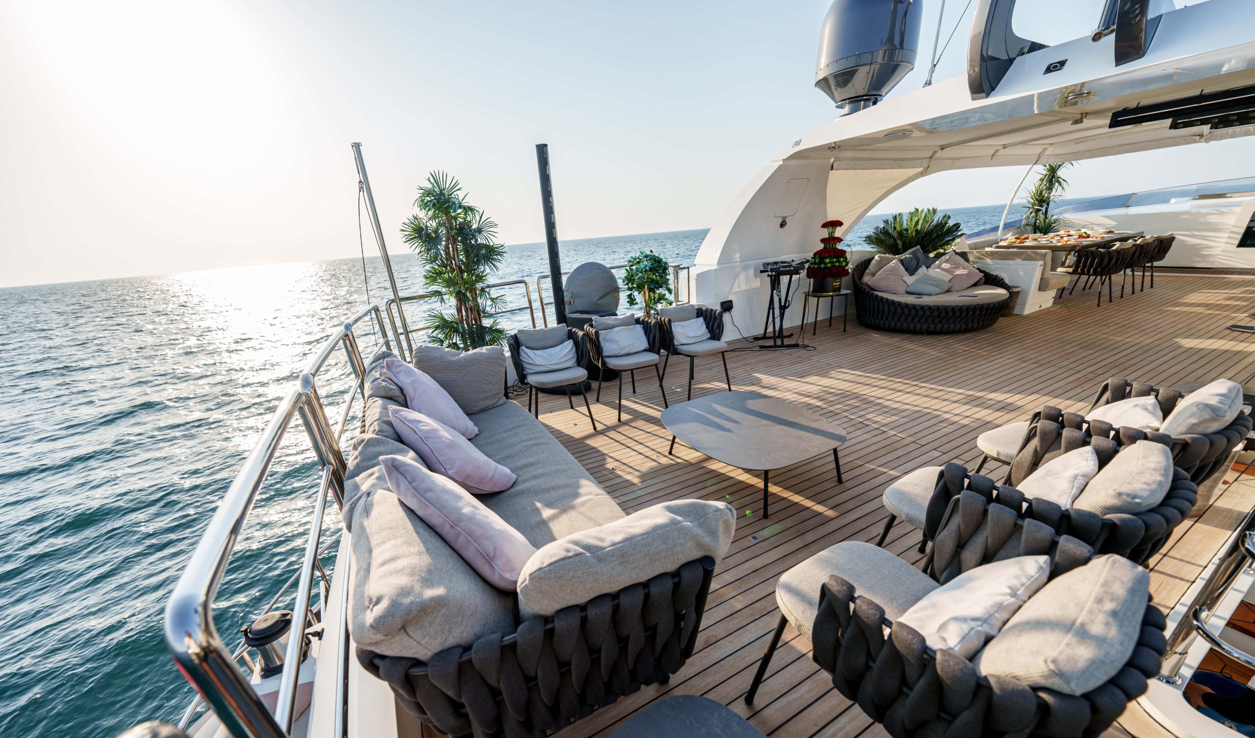Outdoor living aboard TATTI is designed for easy enjoyment. The open deck provides space for sunbathing and fresh-air relaxation, while the layout allows guests to gather comfortably and enjoy Dubai’s skyline views. Every space encourages a pleasant and social onboard experience.