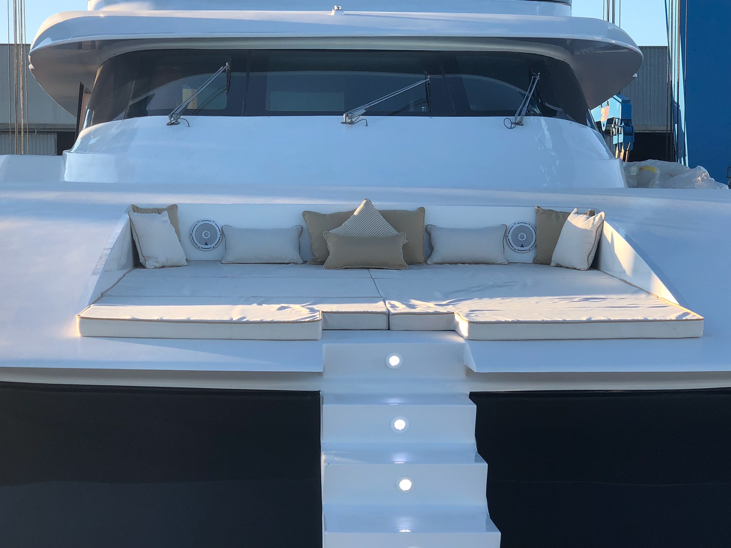 Outdoor living is a highlight on board. The aft deck provides an inviting space for alfresco dining with a large table for up to twelve guests. Above, the flybridge features a Jacuzzi, bar, and generous sunbathing areas, creating an ideal setting for relaxation throughout the day. A large swim platform at the stern allows easy access to the sea and to the yacht’s selection of water toys.