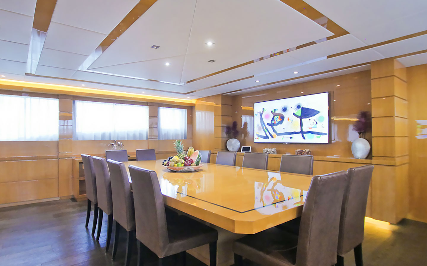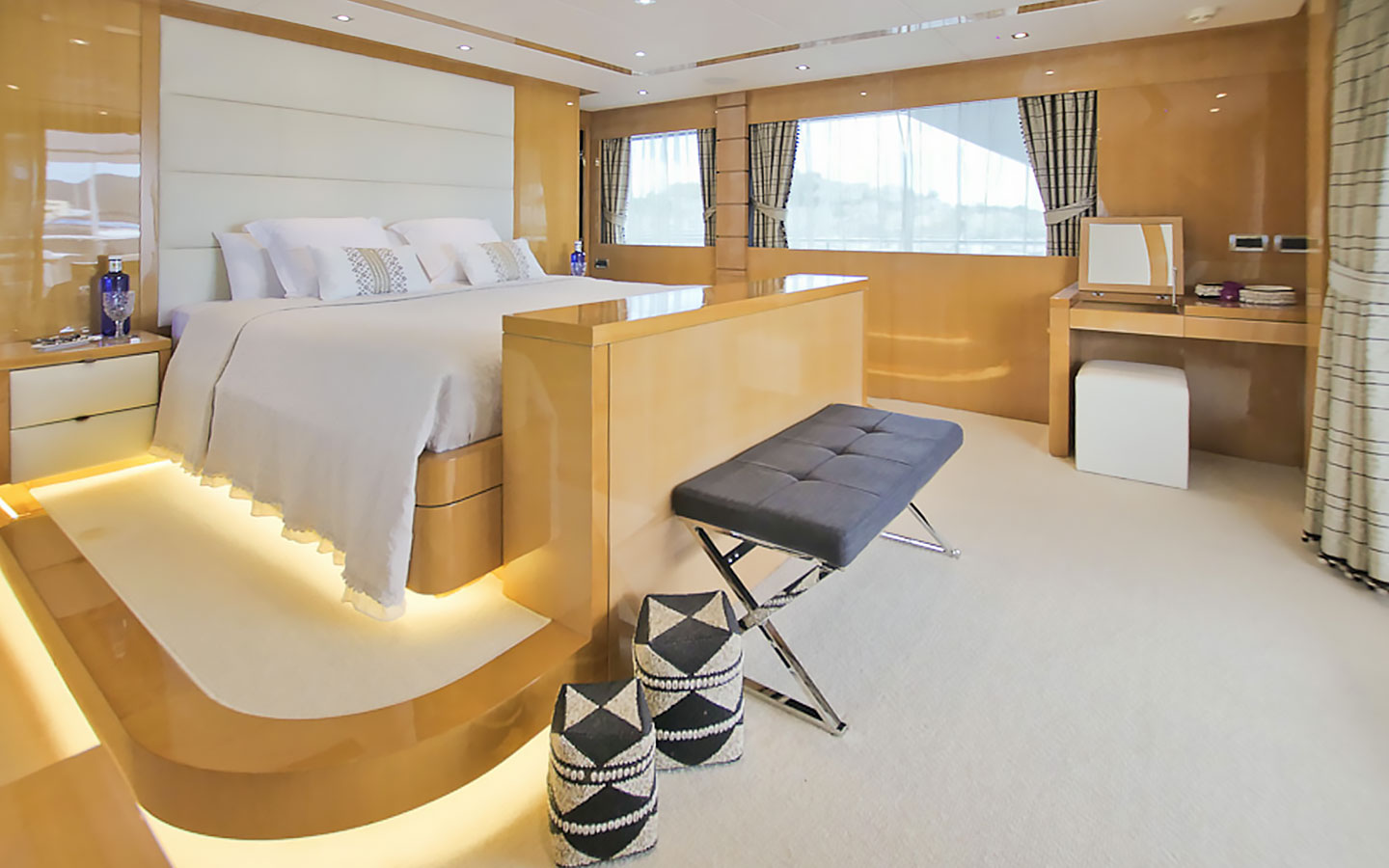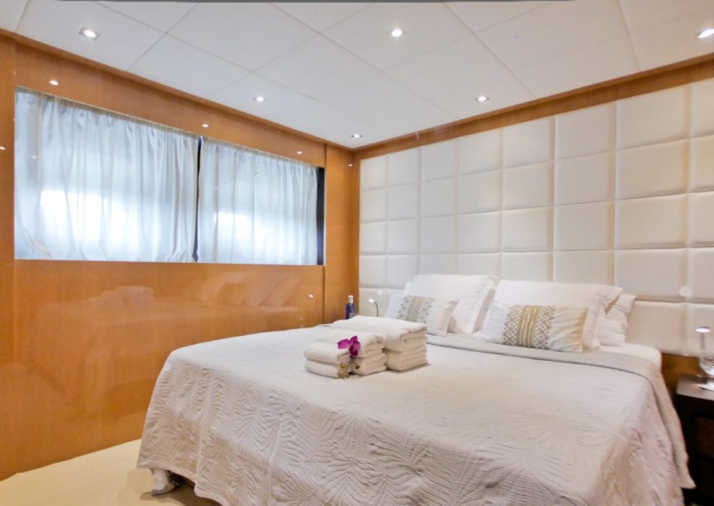 Inside, the yacht offers elegant and spacious living areas across multiple decks. The main salon is bright and welcoming, featuring white leather sofas, light wood finishes, and a formal dining table for up to ten guests. Large windows enhance the sense of space and provide natural light throughout. Accommodation is arranged across seven guest cabins. The lower deck hosts four double cabins and two twin cabins, all with en-suite bathrooms, while the entire upper deck is dedicated to the impressive Master suite, complete with a private terrace and a spacious en-suite bathroom finished in marble.
