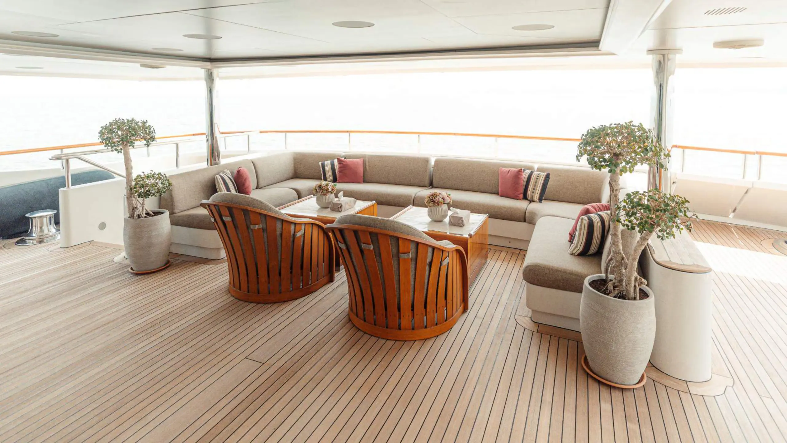 Outdoor living is a defining feature of ZIFZAF. Spread across three expansive decks, guests can enjoy multiple areas for relaxing, dining, and entertaining. The sundeck is a standout space, complete with a Jacuzzi and bar, making it ideal for enjoying open views, daytime relaxation, or evening gatherings. Additional deck areas offer flexible layouts for social events or quiet moments at sea.