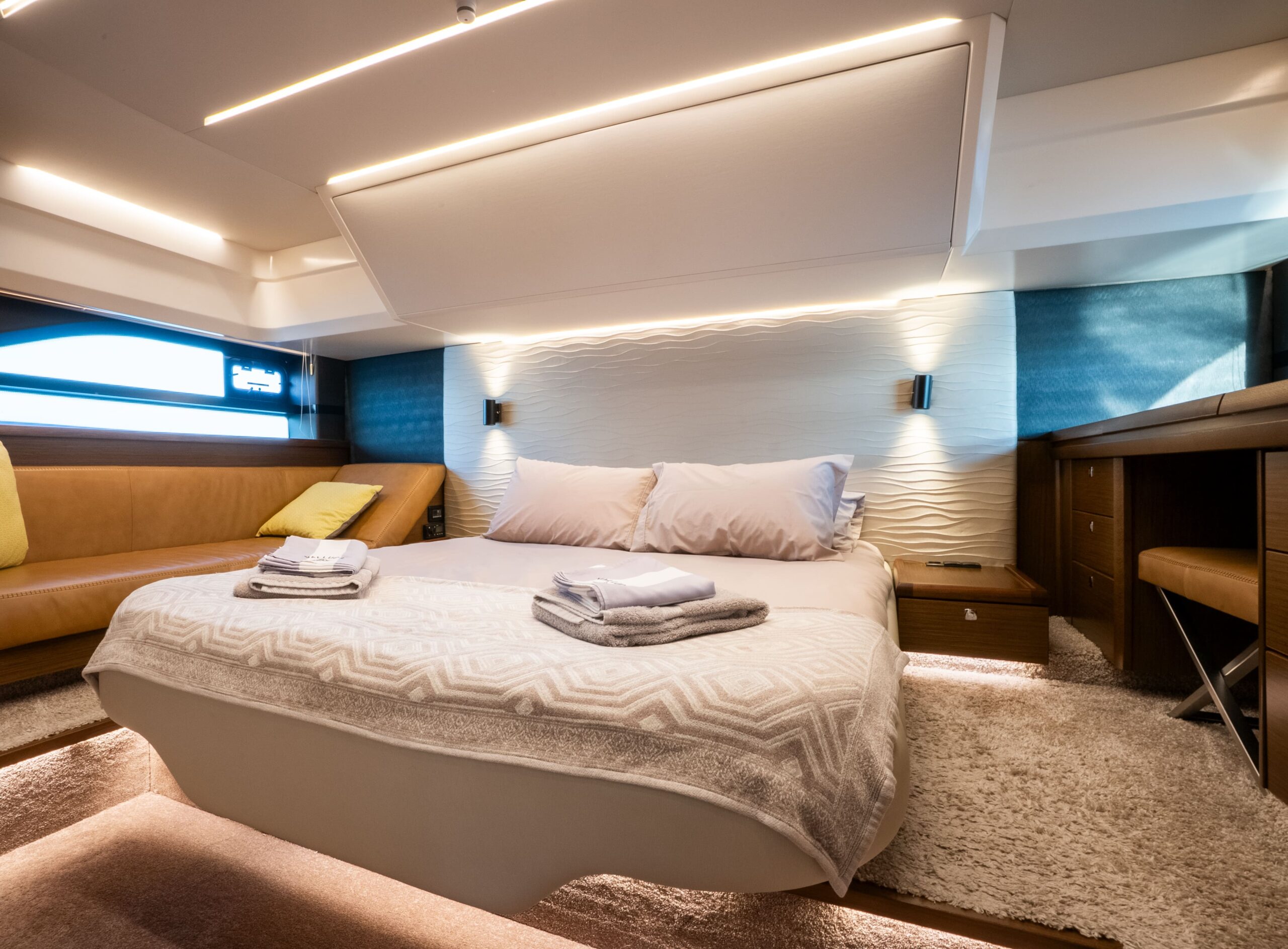 - Owner’s Cabin: full-beam berth, walk-in wardrobe, sofa, dressing table, en-suite shower, AC, TV