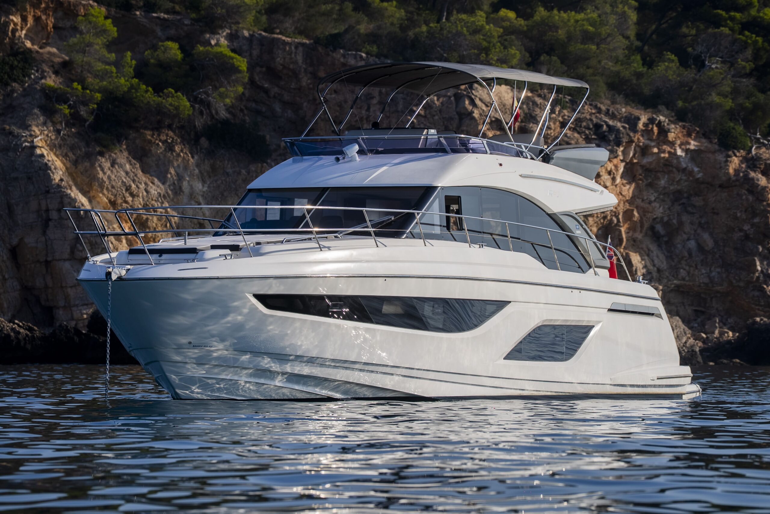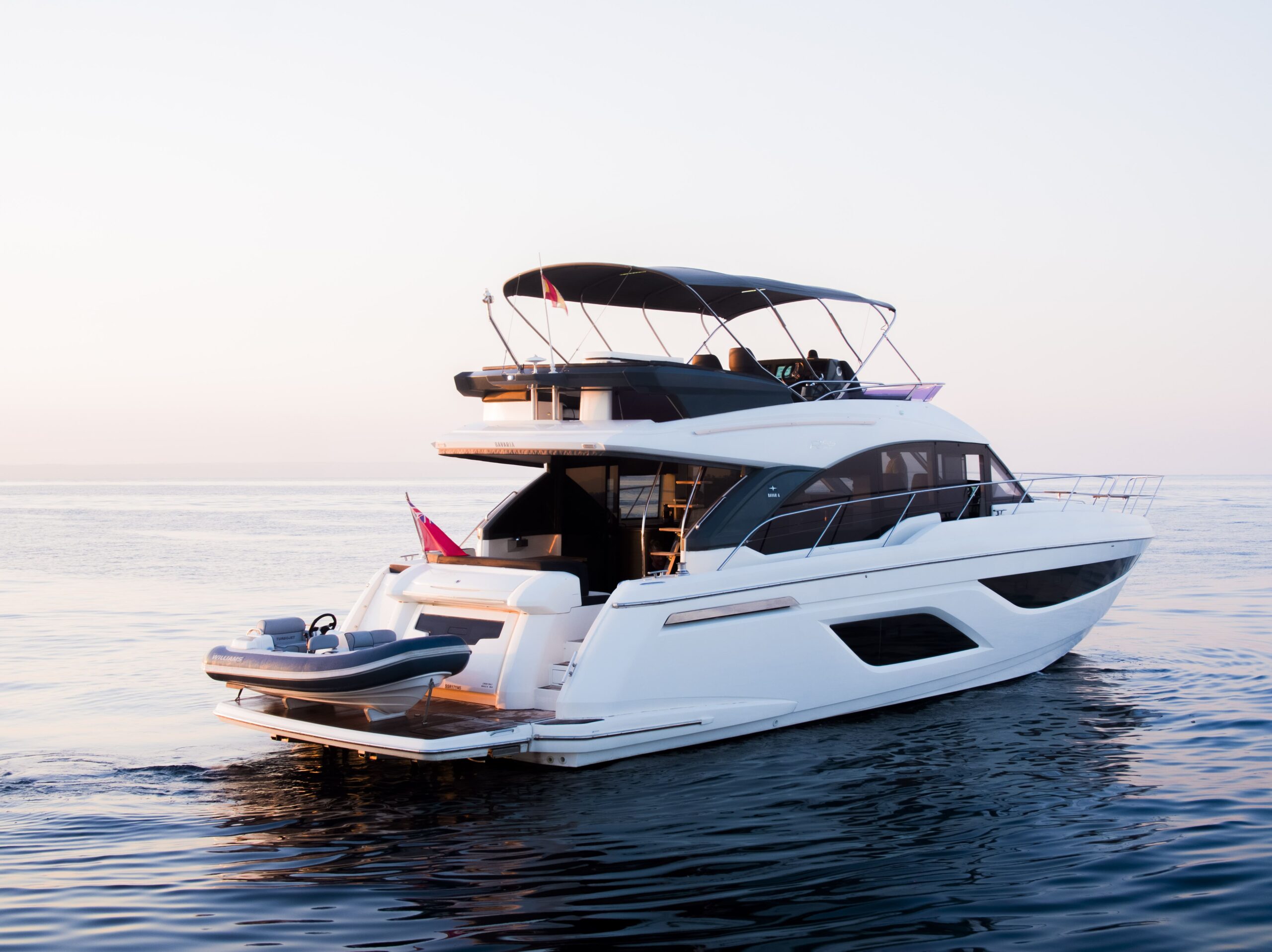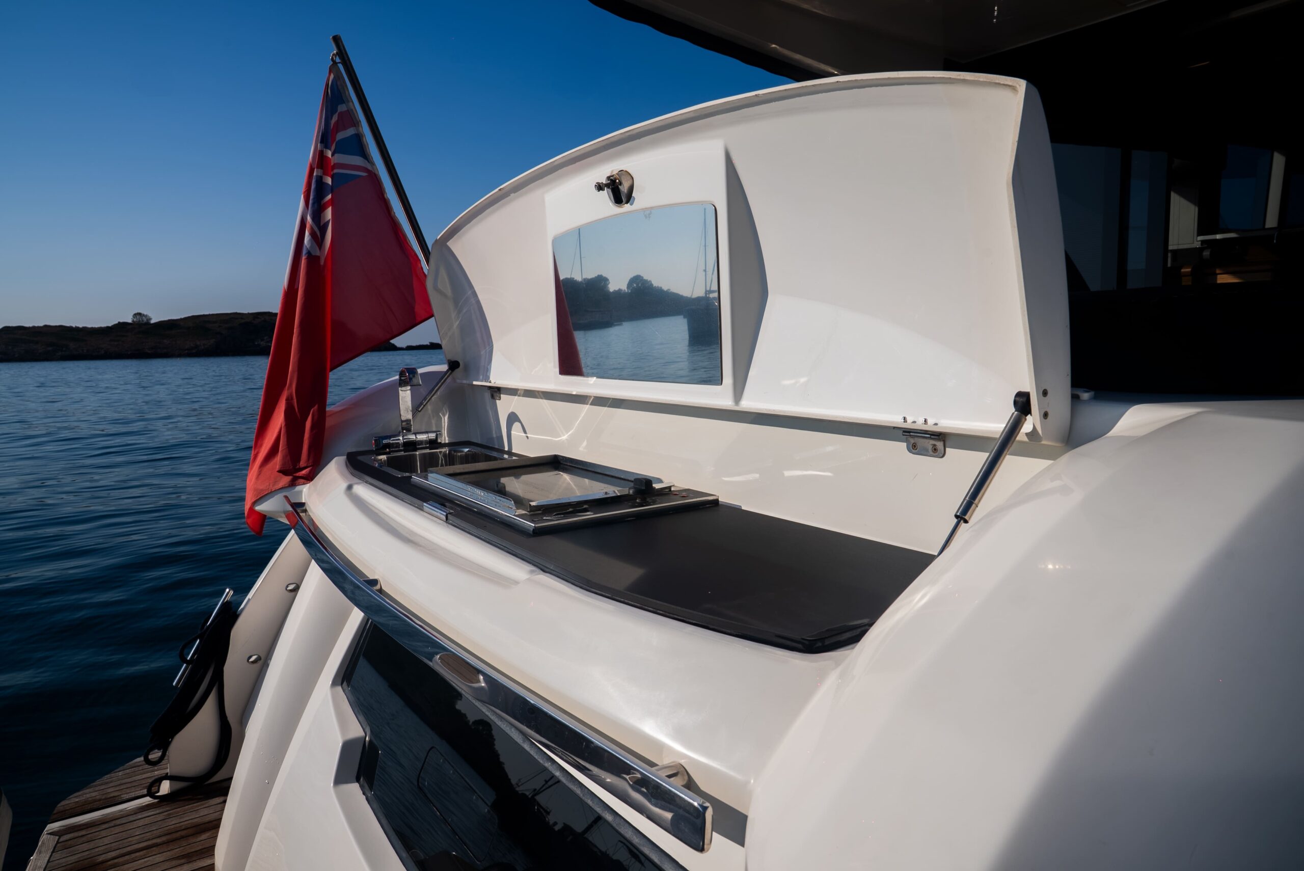 - Flybridge: sun pad, helm station, port seating, wet bar with electric BBQ, sink, fridge, foldable bimini