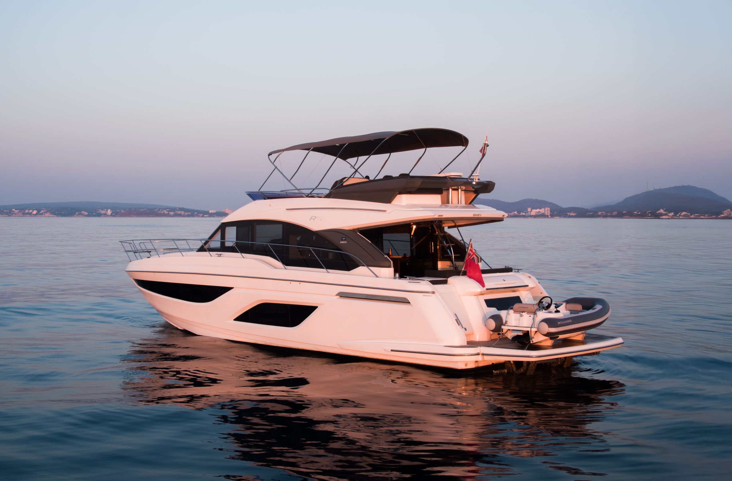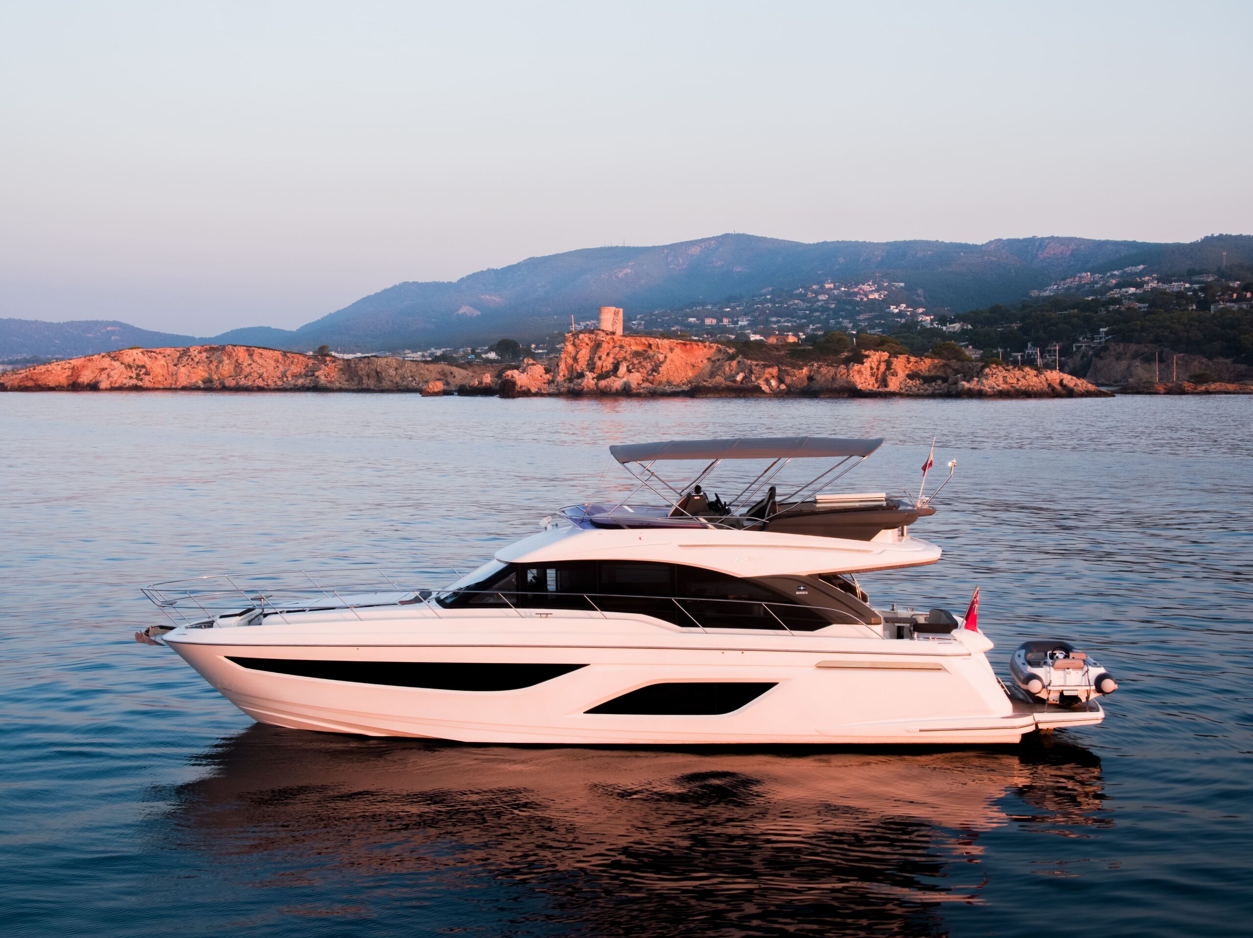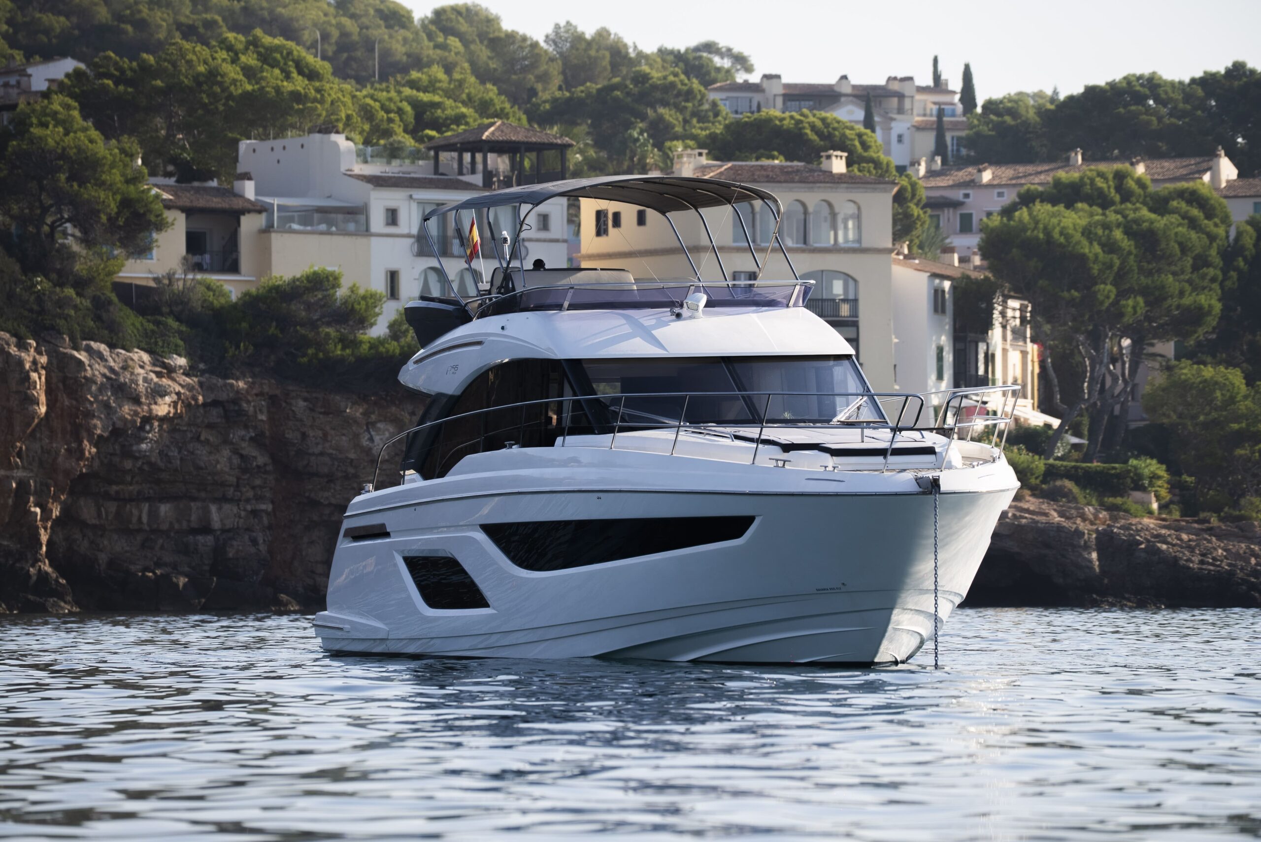 - Flybridge: sun pad, helm station, port seating, wet bar with electric BBQ, sink, fridge, foldable bimini