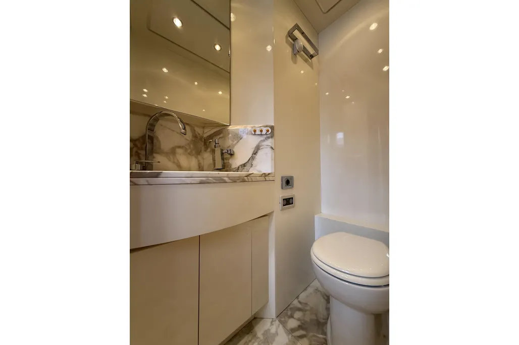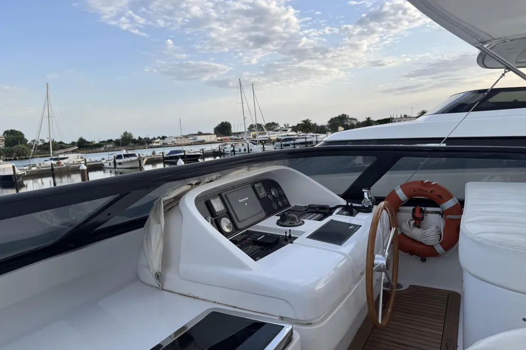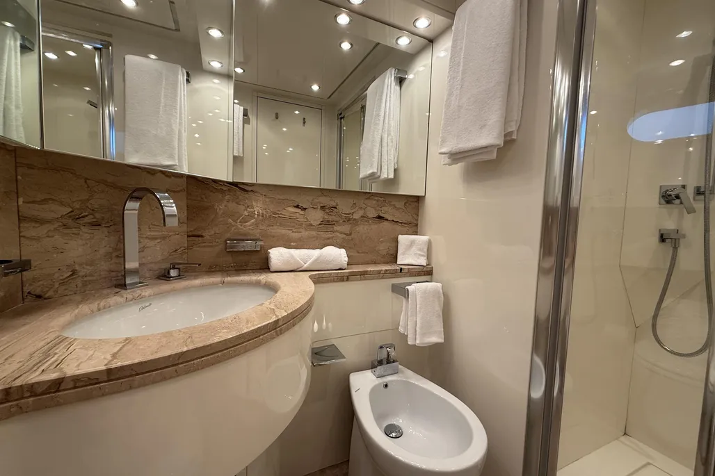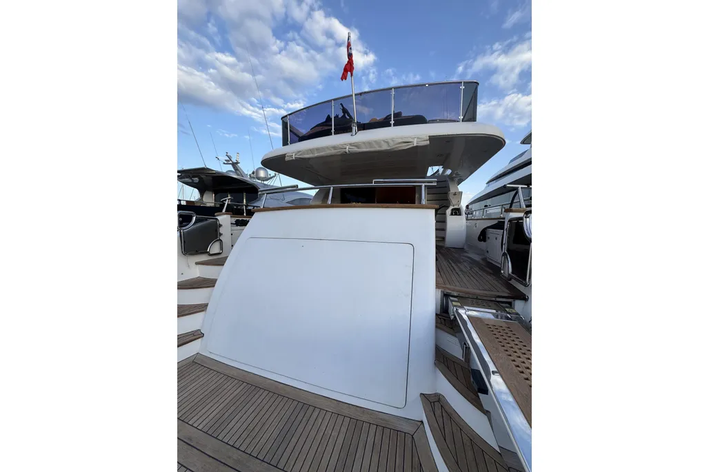 Spacious exterior areas feature a sheltered aft cockpit for elegant dining and a well-appointed flybridge with dining area, bar, and generous seating, ideal for entertaining or relaxing at sea.