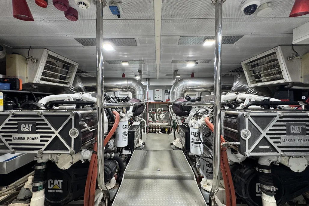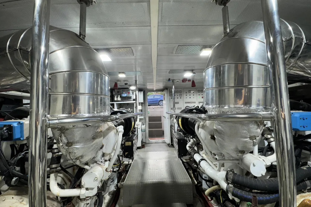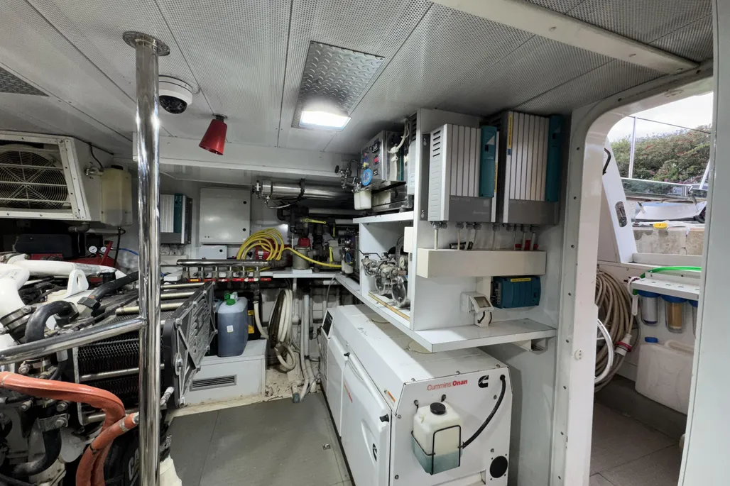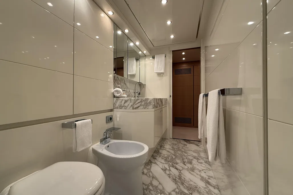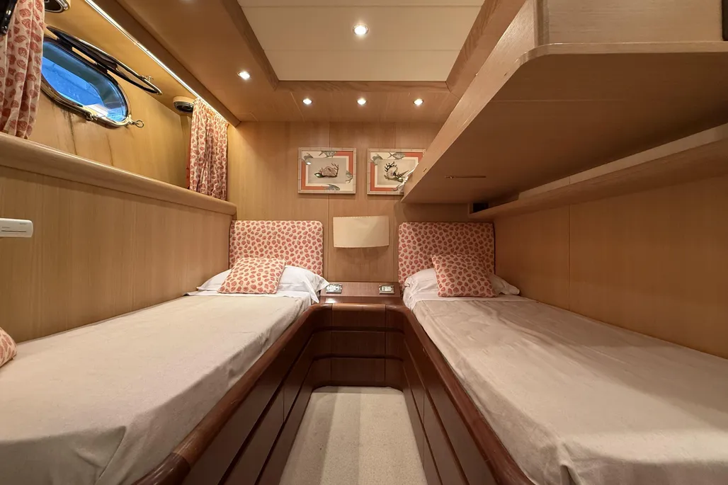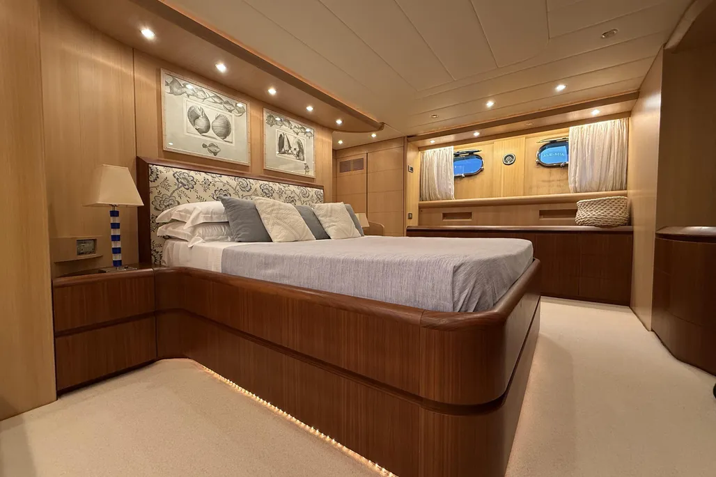 The interior layout includes four spacious guest cabins with en-suite bathrooms, complemented by two independent crew cabins for maximum privacy. High-quality finishes, full air conditioning, blackout curtains, a Bose sound system, and Smart TVs in every cabin elevate comfort on board, while the fully equipped galley with Siemens and Liebherr appliances combines style and functionality.