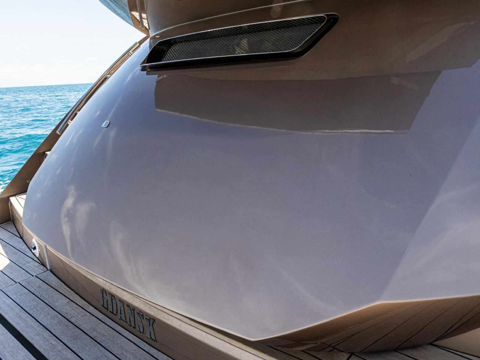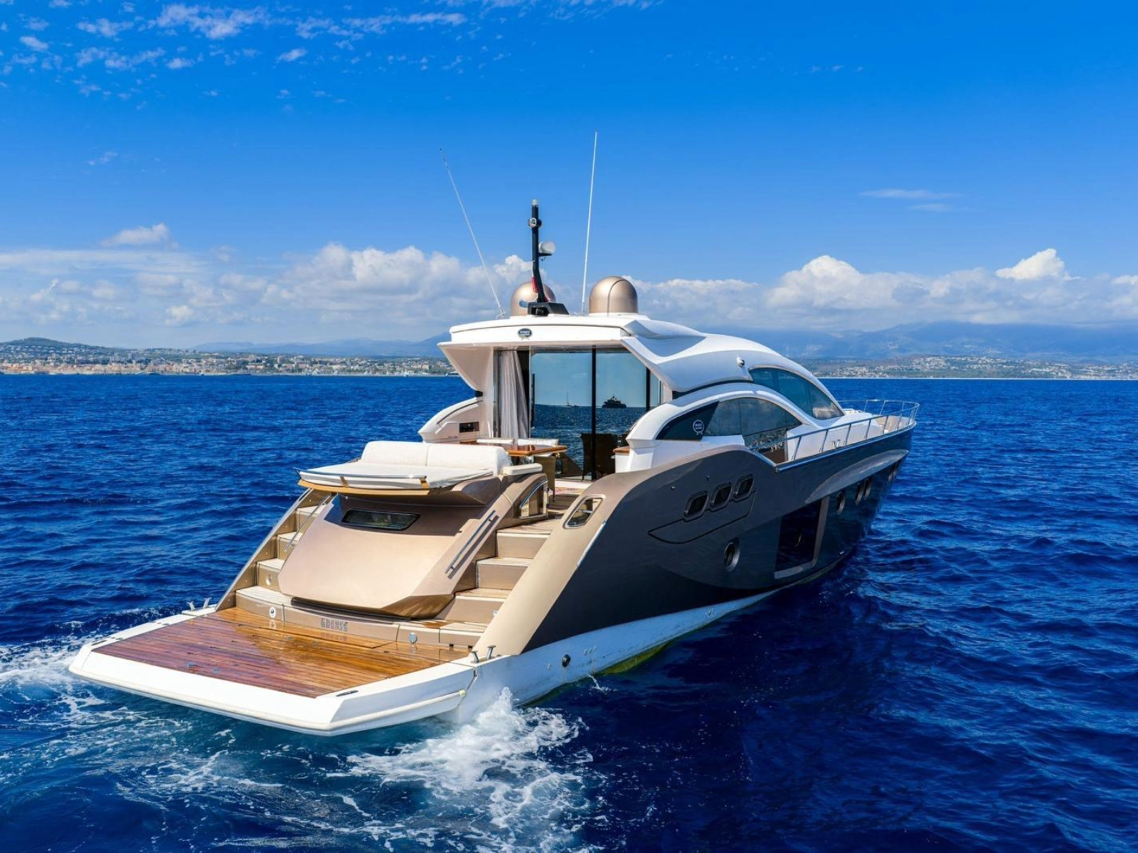 The yacht boasts a striking Gold Metallic hull. The main deck features a spacious outdoor dining area with a large built-in sun lounger. An electric canopy provides shade during meals, while built-in cabinets house a drink refrigerator and ice maker. A discreet hatch conceals a secondary control panel for docking. Side decks lead to additional seating and sunbathing areas at the bow.