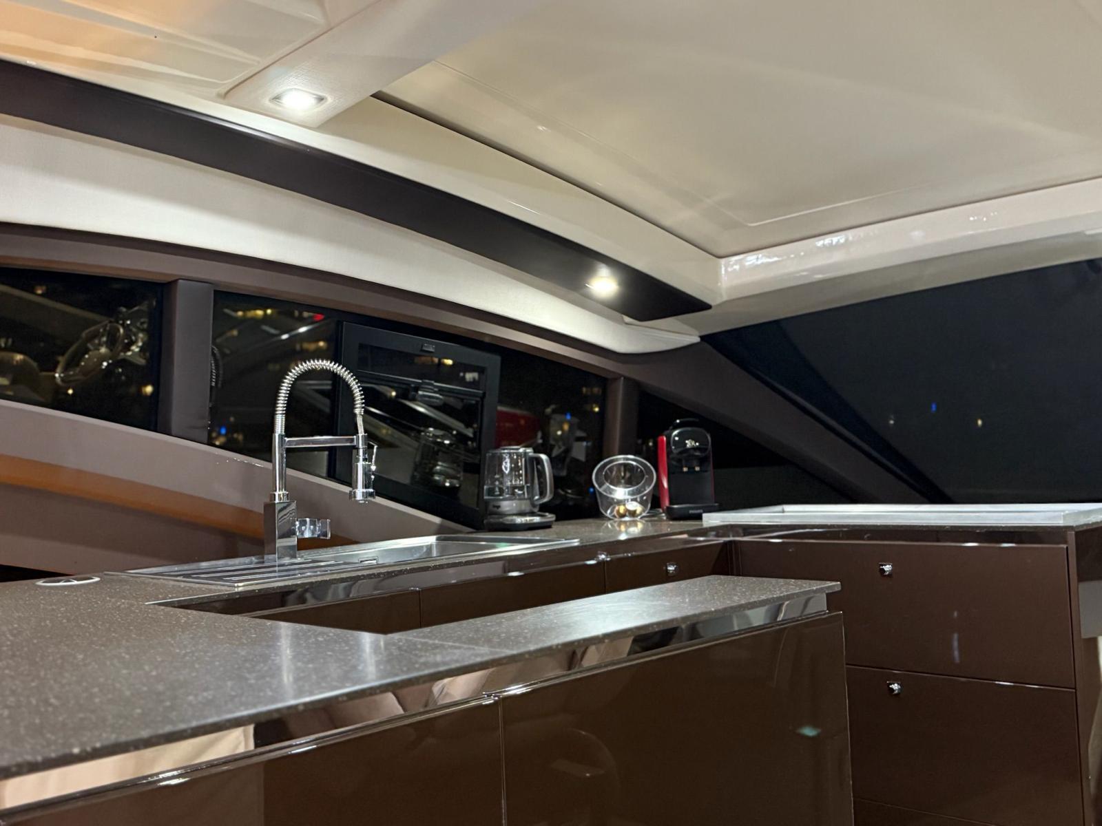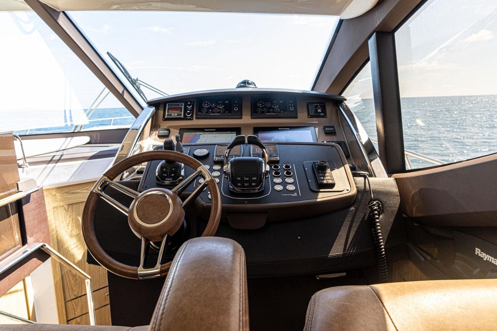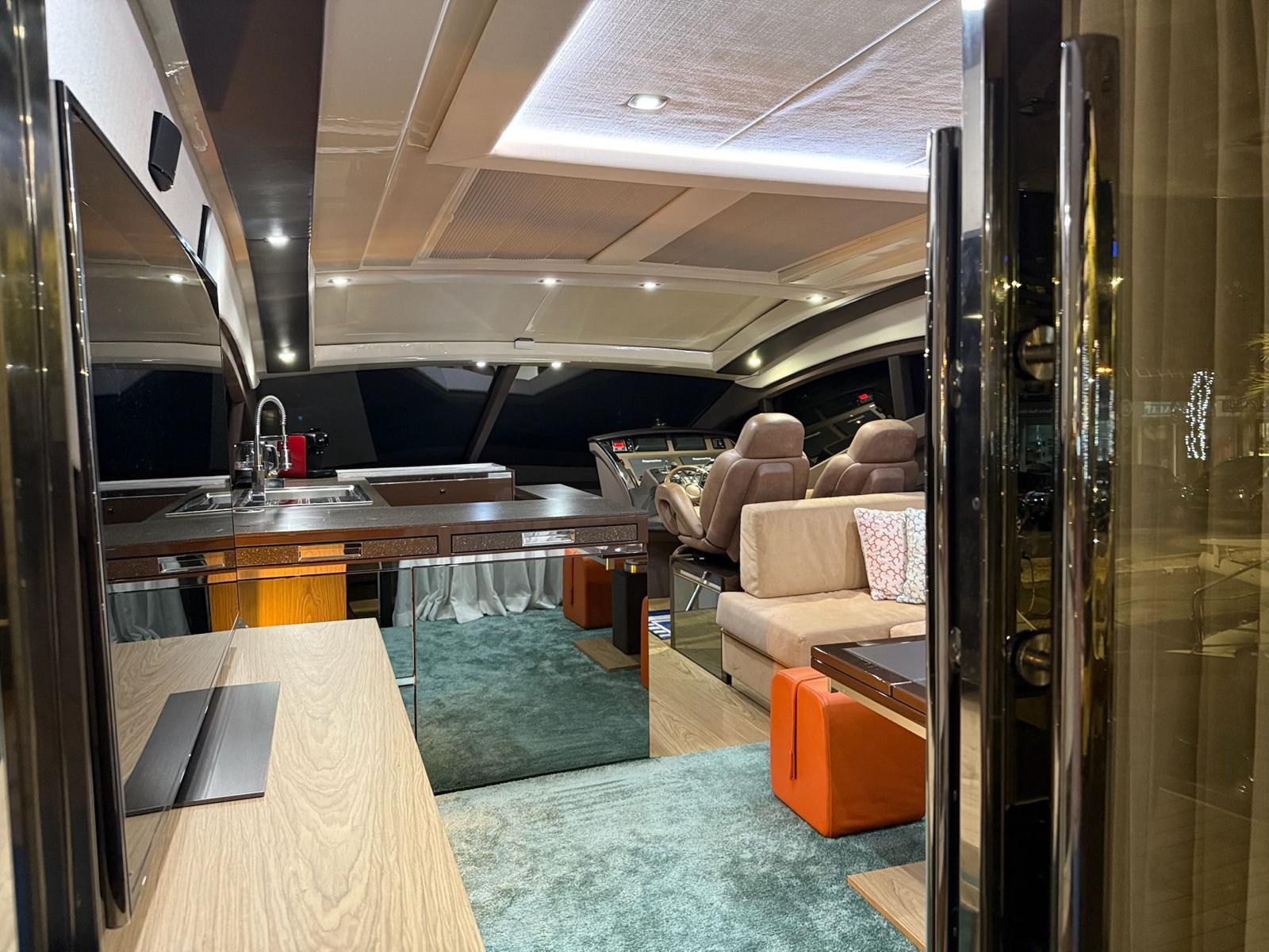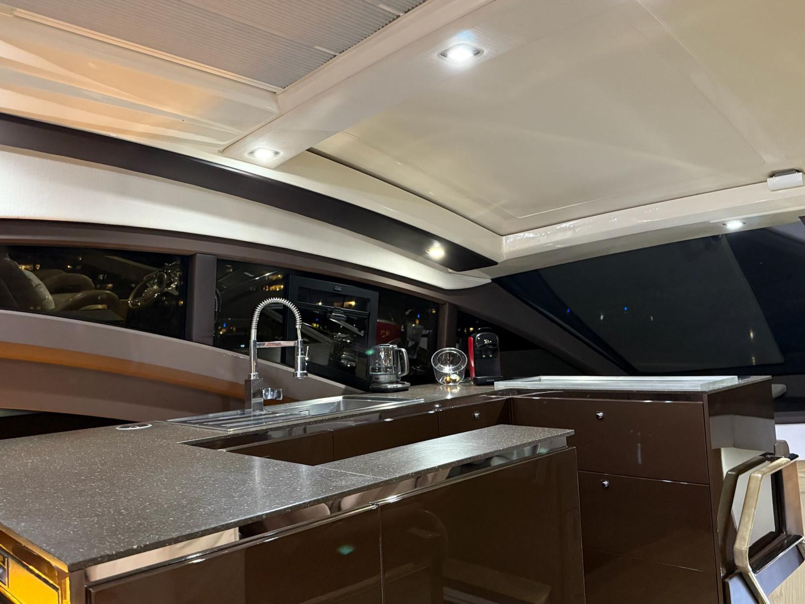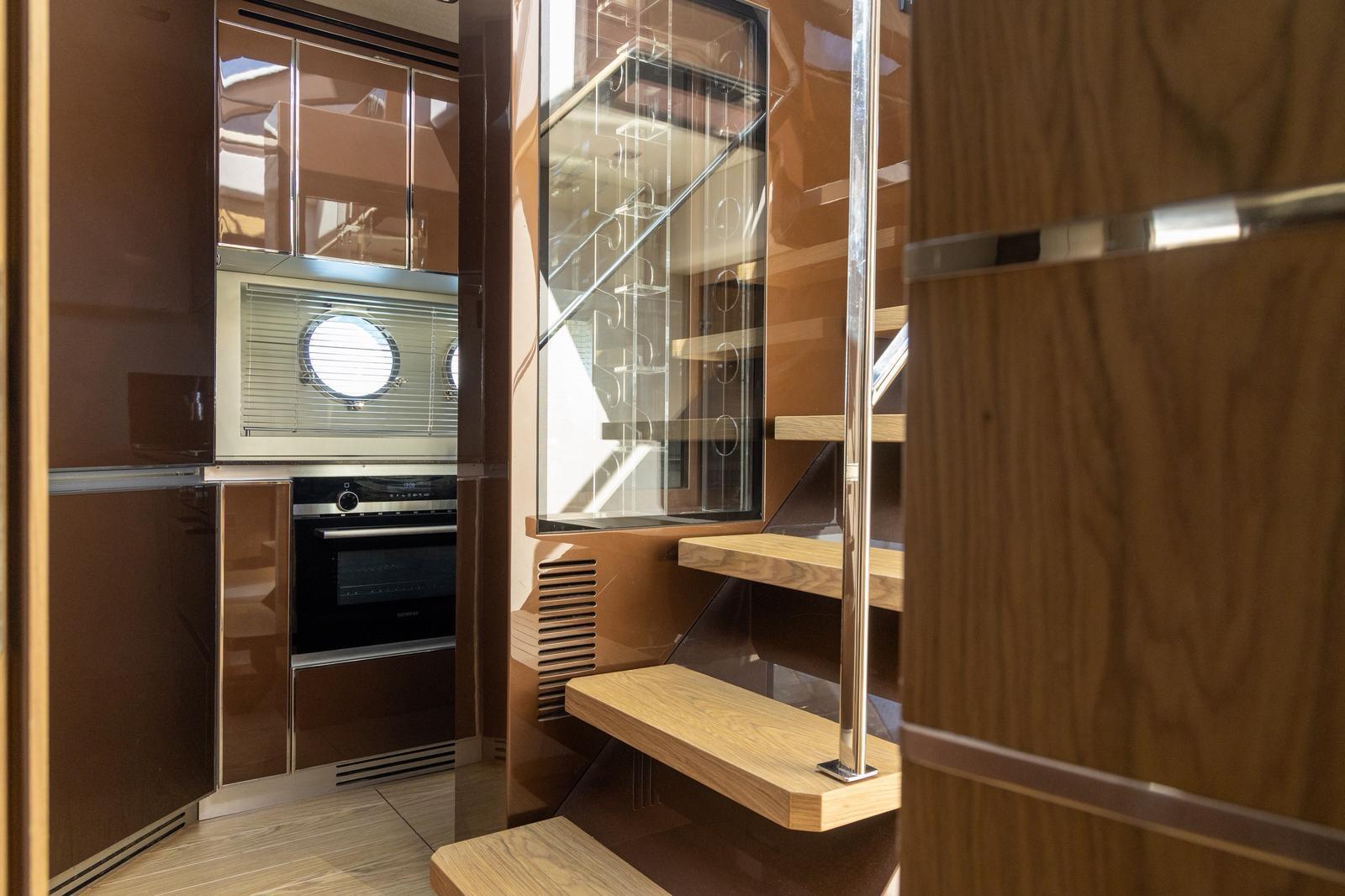 Inside, the salon is bright and airy, with a fixed skylight and a full-width sliding hatch that opens the space to sea breezes. It includes a convertible table for six, an L-shaped sofa, and a fully equipped bar area with a sink, cooktop, retractable extractor, and beverage refrigerator. The helm station within the salon features two electrically adjustable seats. The galley on the lower deck is fitted with a full-size refrigerator with freezer, oven, and sink.
