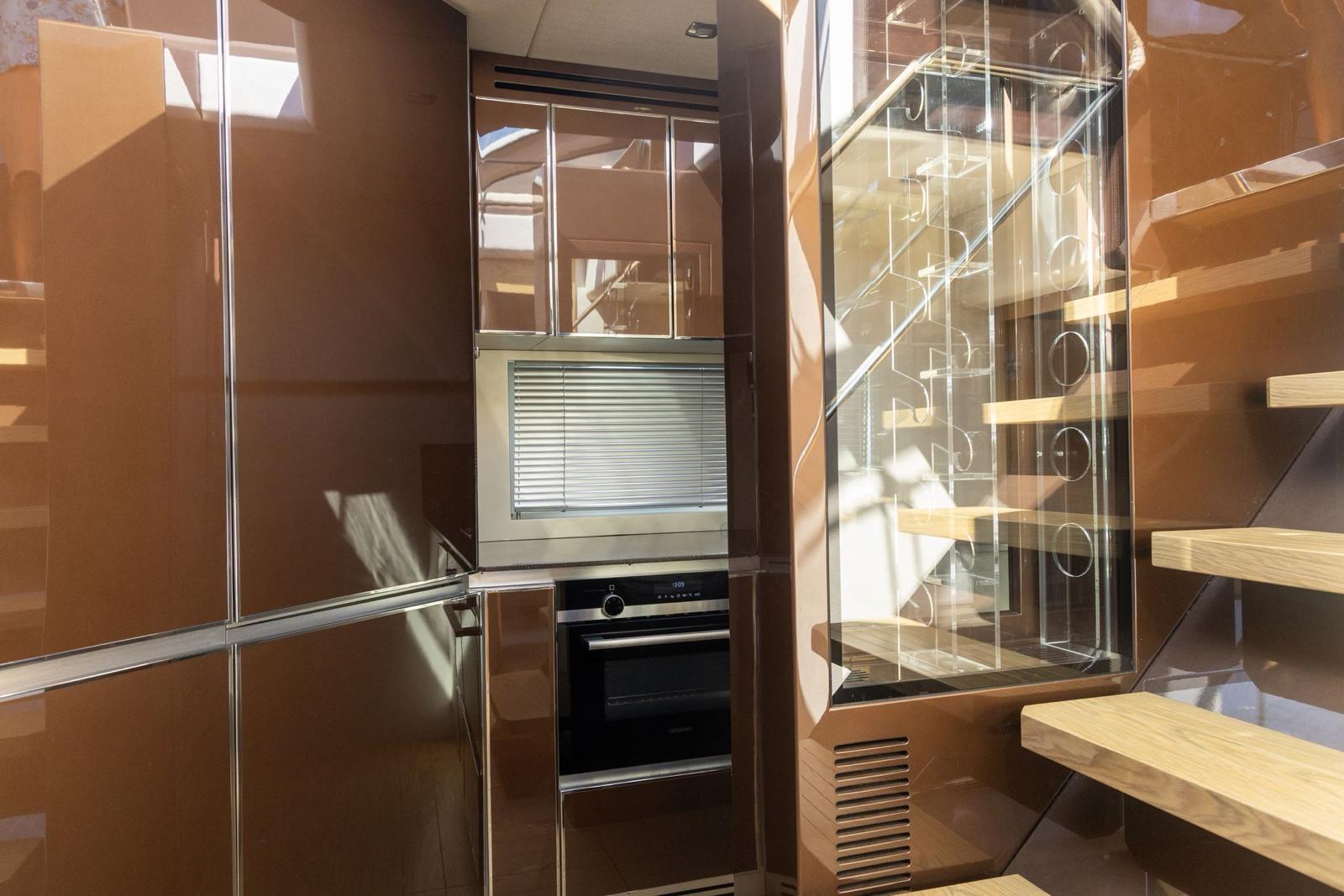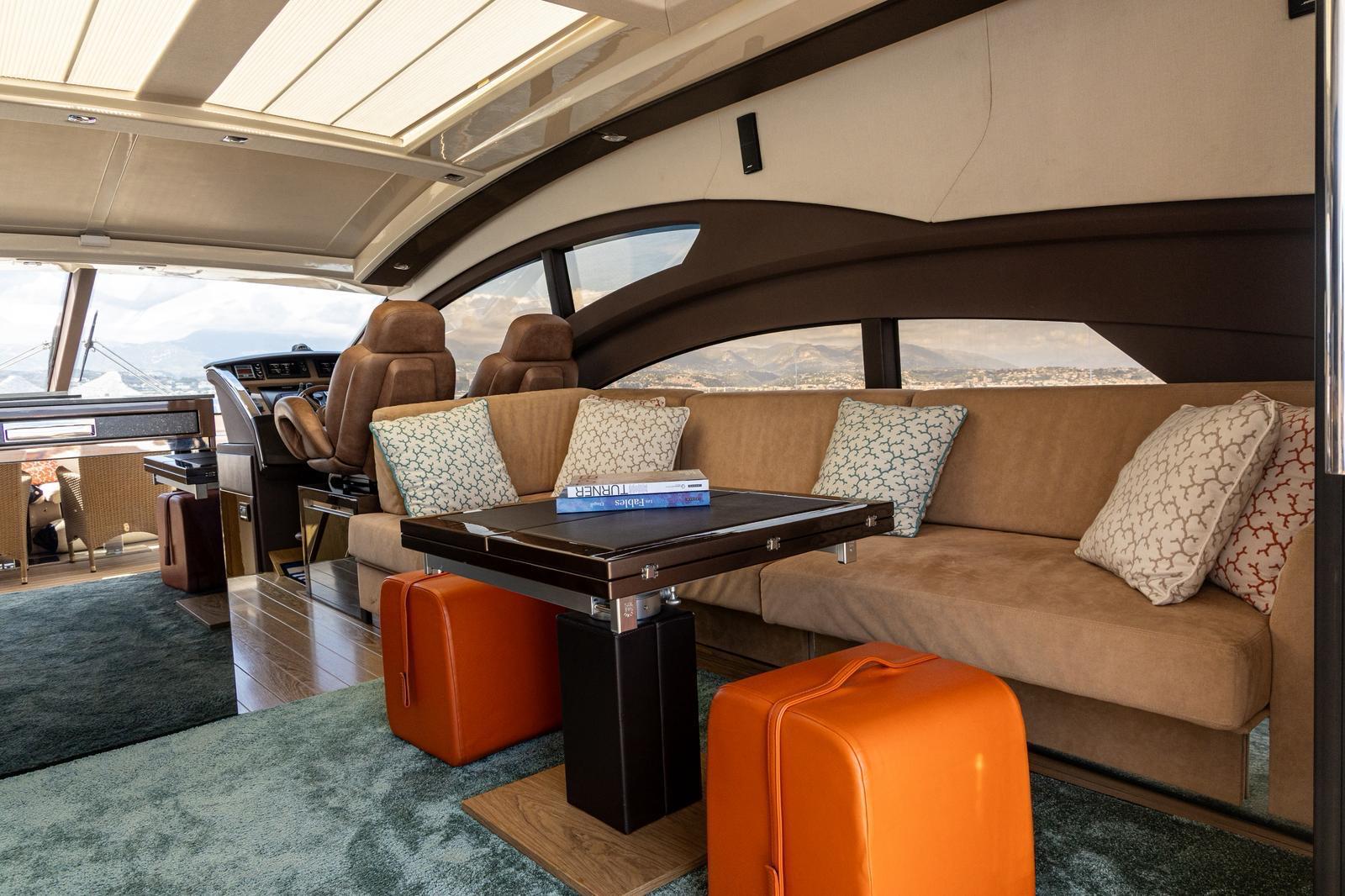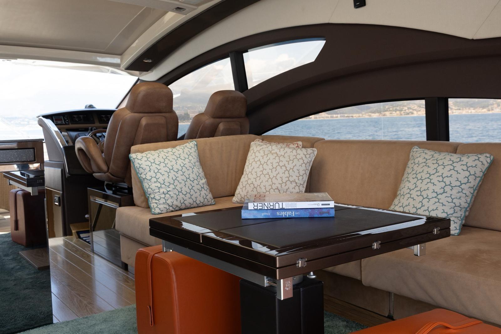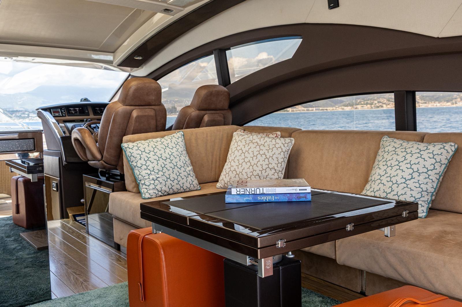 Inside, the salon is bright and airy, with a fixed skylight and a full-width sliding hatch that opens the space to sea breezes. It includes a convertible table for six, an L-shaped sofa, and a fully equipped bar area with a sink, cooktop, retractable extractor, and beverage refrigerator. The helm station within the salon features two electrically adjustable seats. The galley on the lower deck is fitted with a full-size refrigerator with freezer, oven, and sink.