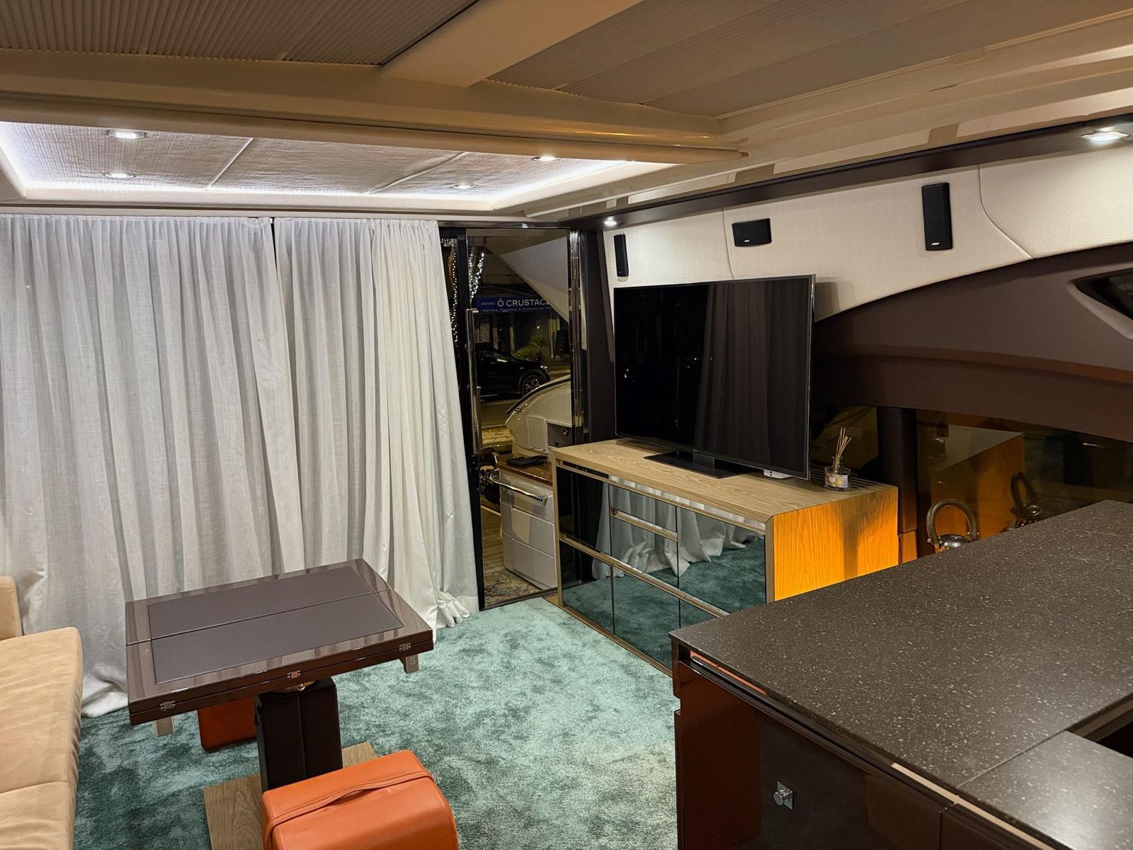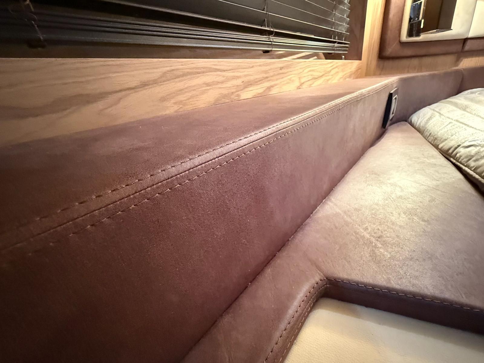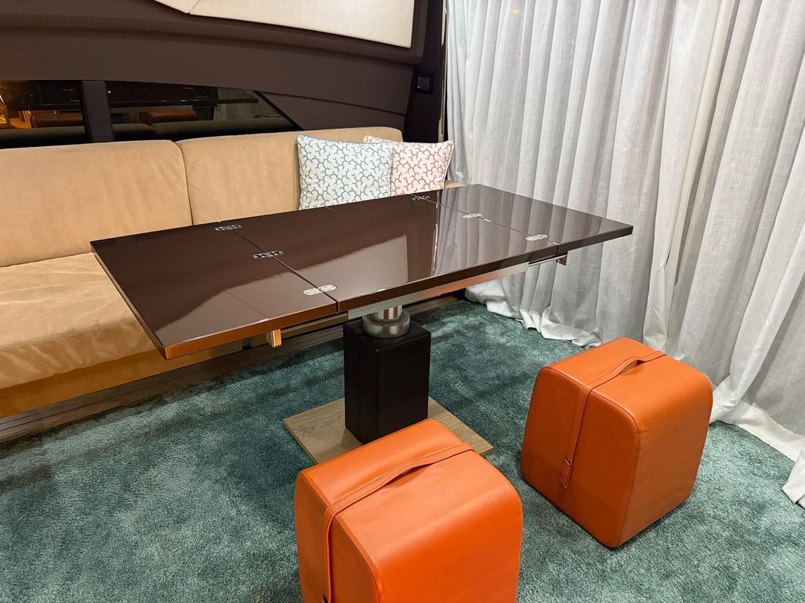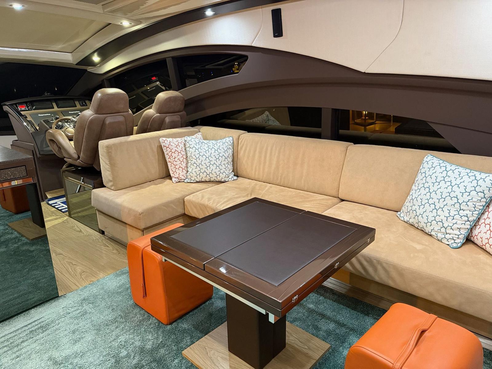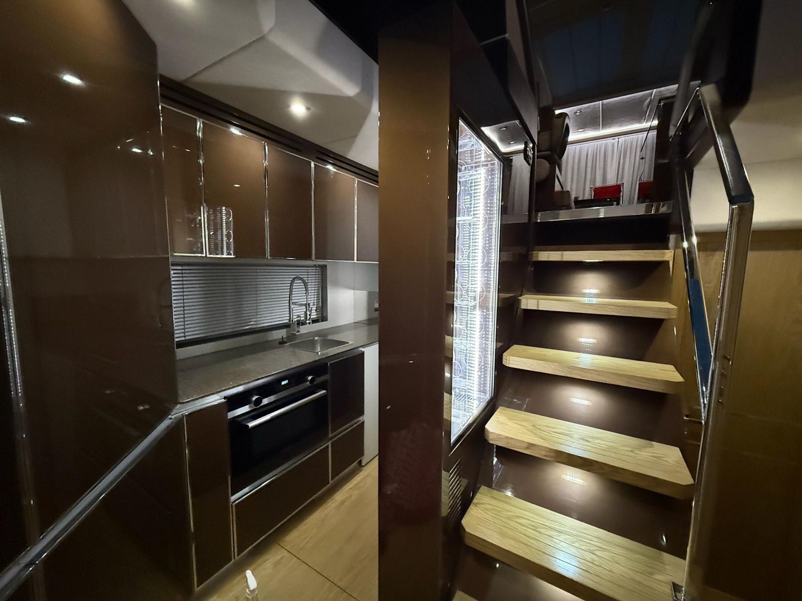 Inside, the salon is bright and airy, with a fixed skylight and a full-width sliding hatch that opens the space to sea breezes. It includes a convertible table for six, an L-shaped sofa, and a fully equipped bar area with a sink, cooktop, retractable extractor, and beverage refrigerator. The helm station within the salon features two electrically adjustable seats. The galley on the lower deck is fitted with a full-size refrigerator with freezer, oven, and sink.