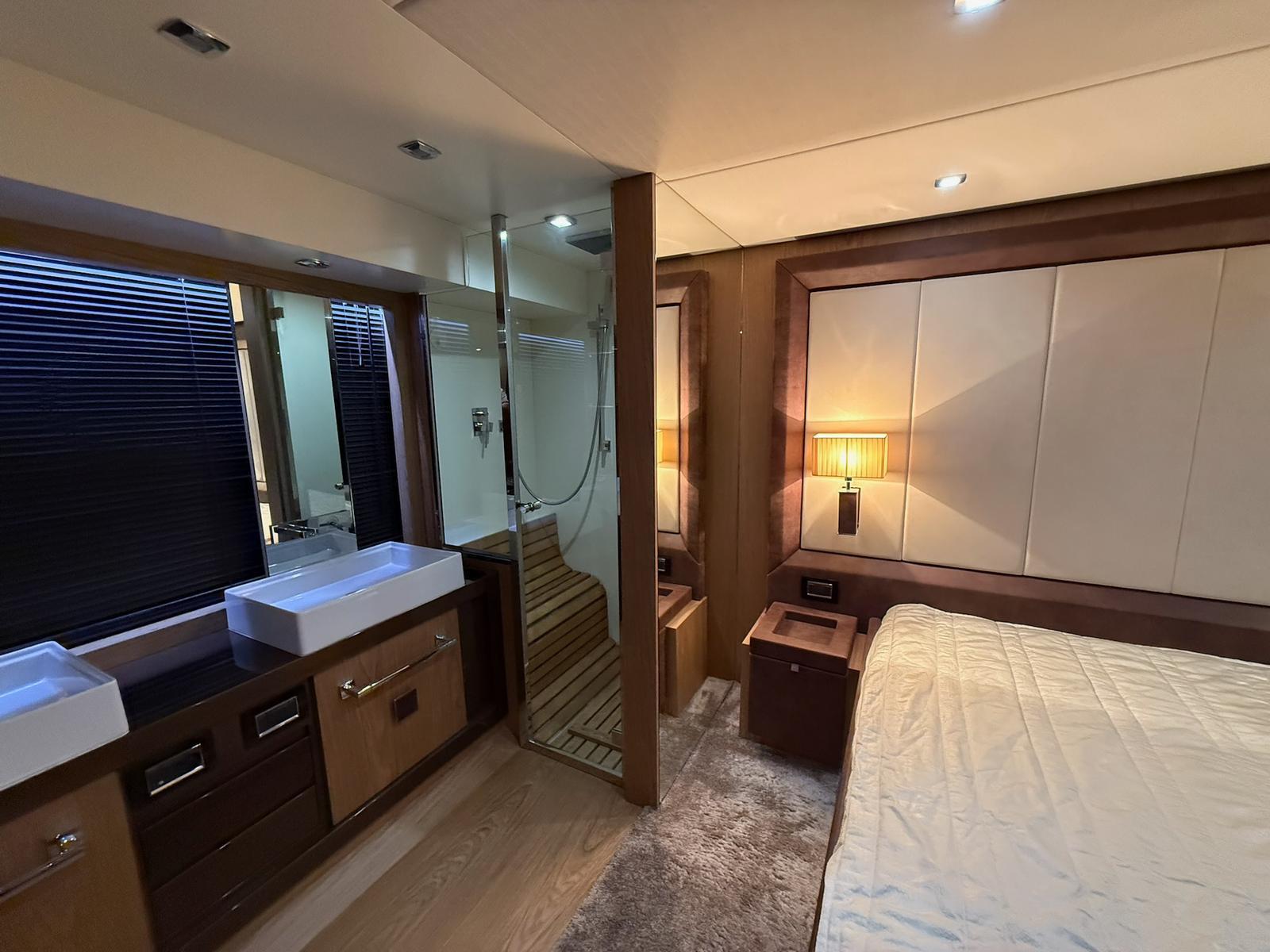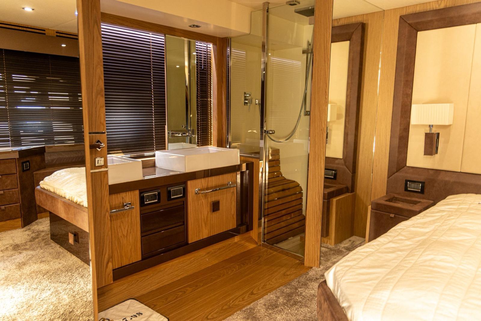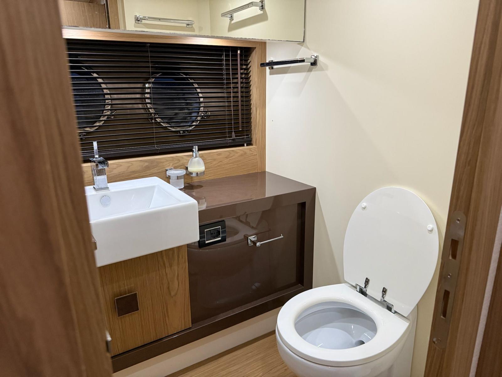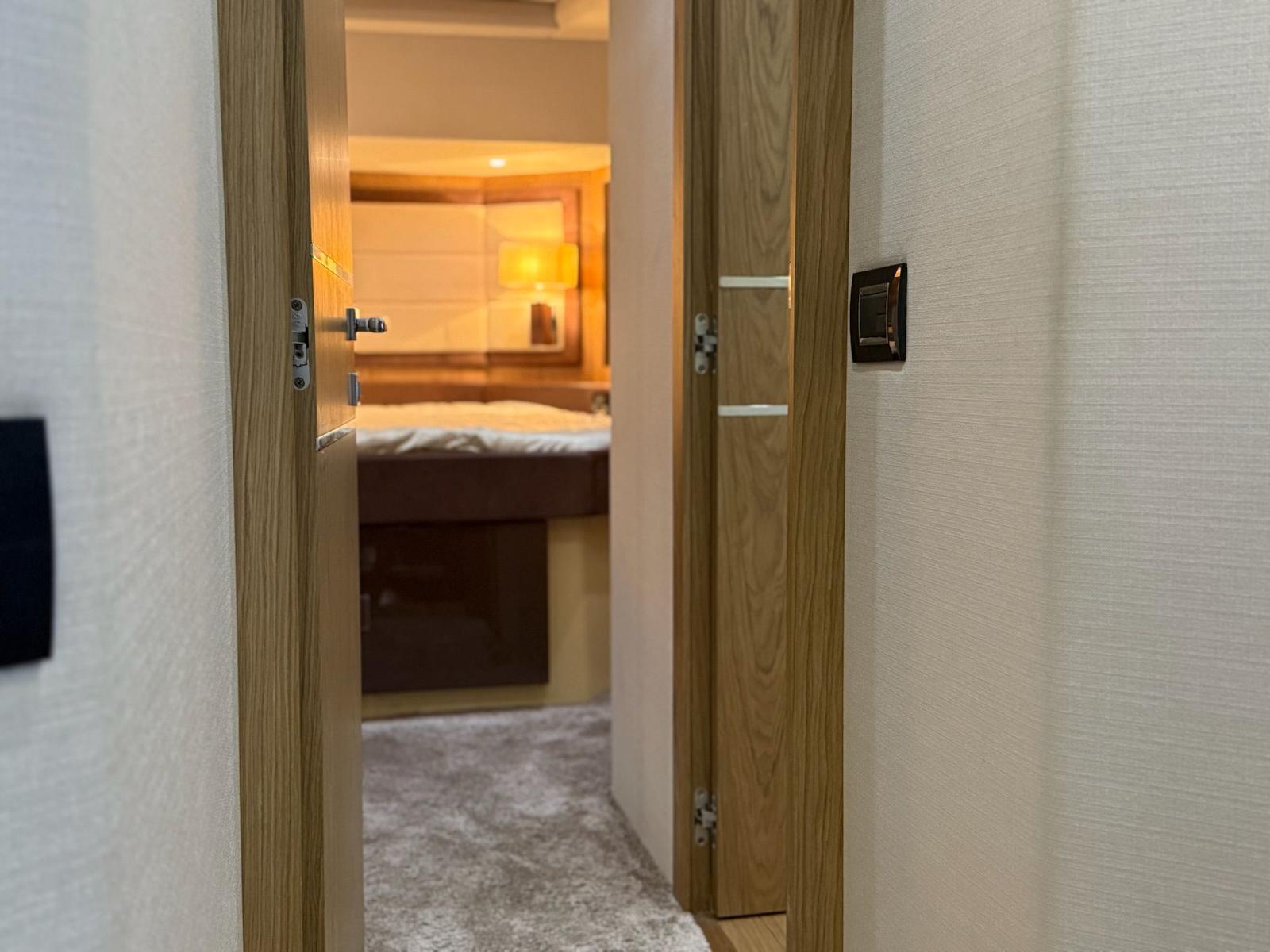 Accommodation on the lower deck includes three cabins: a spacious master amidships, a VIP cabin at the bow, and a smaller cabin suitable for children. Each cabin has an en-suite bathroom and double beds, with the children’s bathroom accessible from the main hallway. A crew cabin with two beds, a bathroom, and washer-dryer is located between the living area and engine room, accessible via a stern door or hatch from the aft deck.