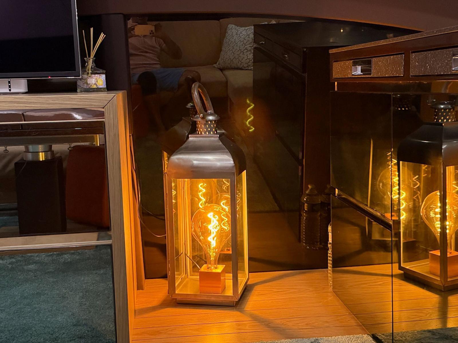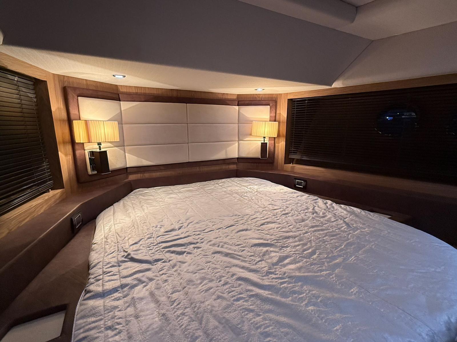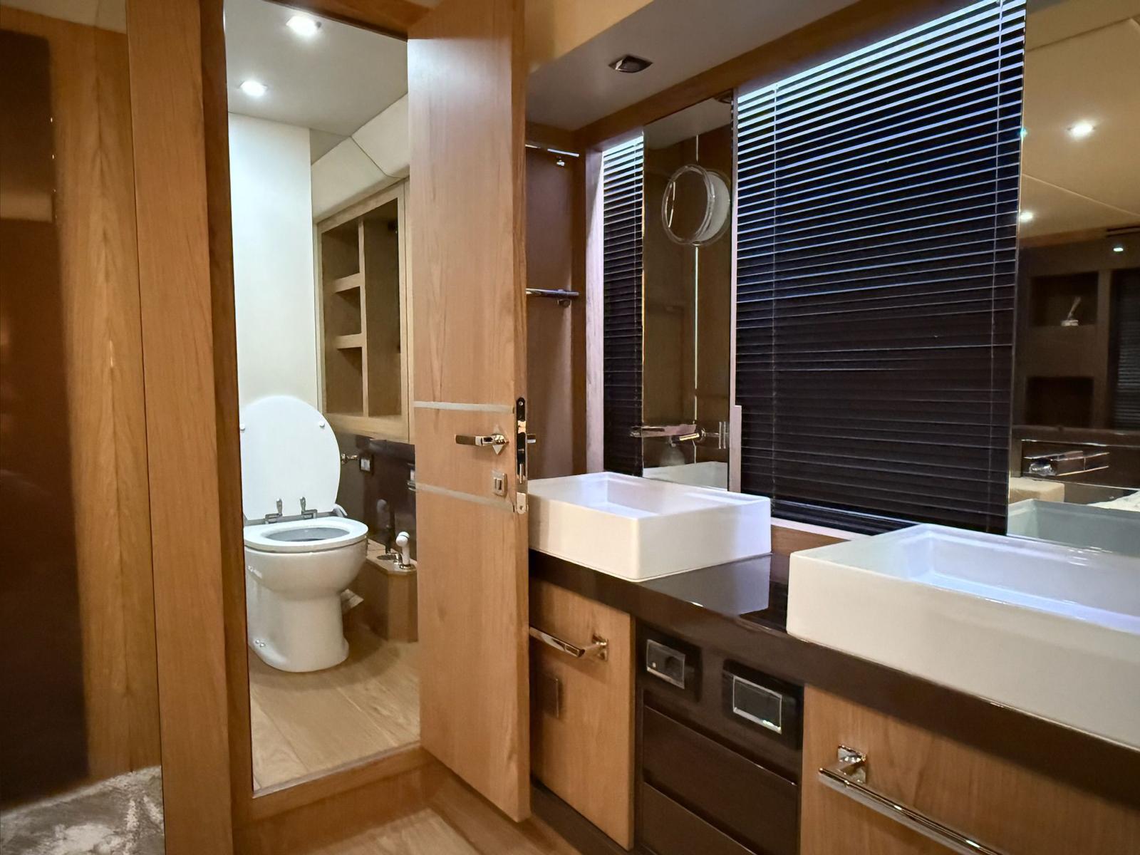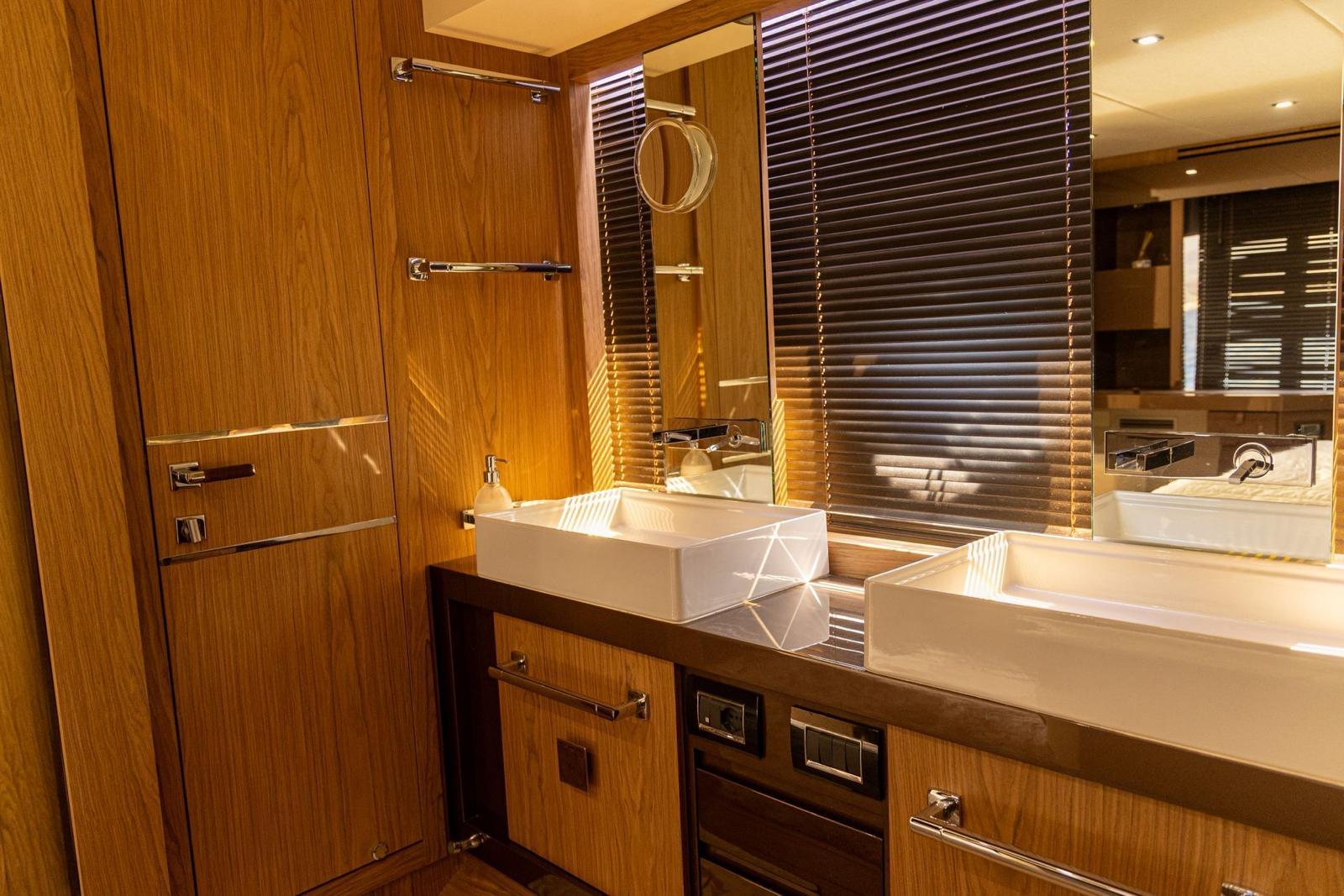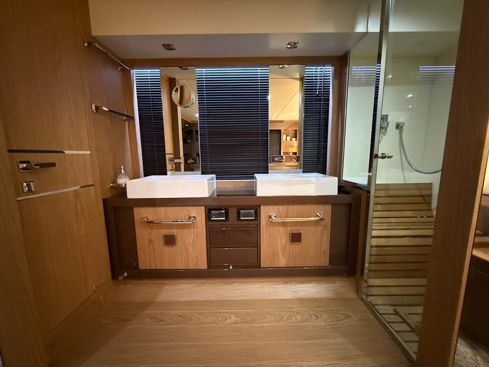 Accommodation on the lower deck includes three cabins: a spacious master amidships, a VIP cabin at the bow, and a smaller cabin suitable for children. Each cabin has an en-suite bathroom and double beds, with the children’s bathroom accessible from the main hallway. A crew cabin with two beds, a bathroom, and washer-dryer is located between the living area and engine room, accessible via a stern door or hatch from the aft deck.